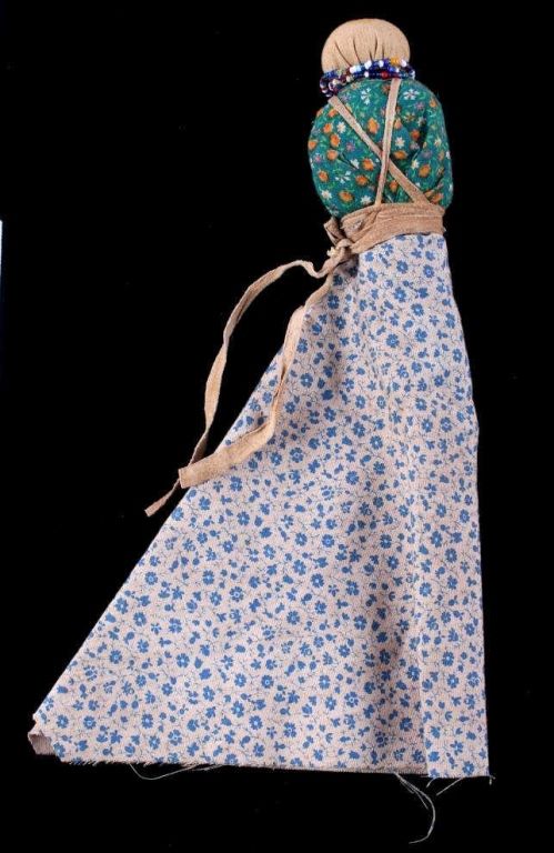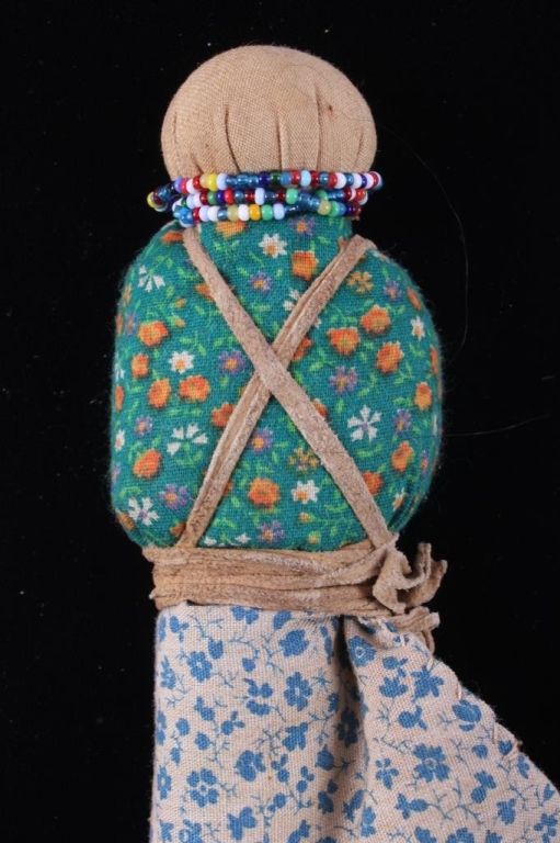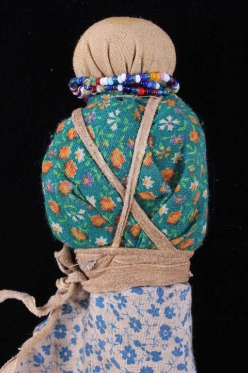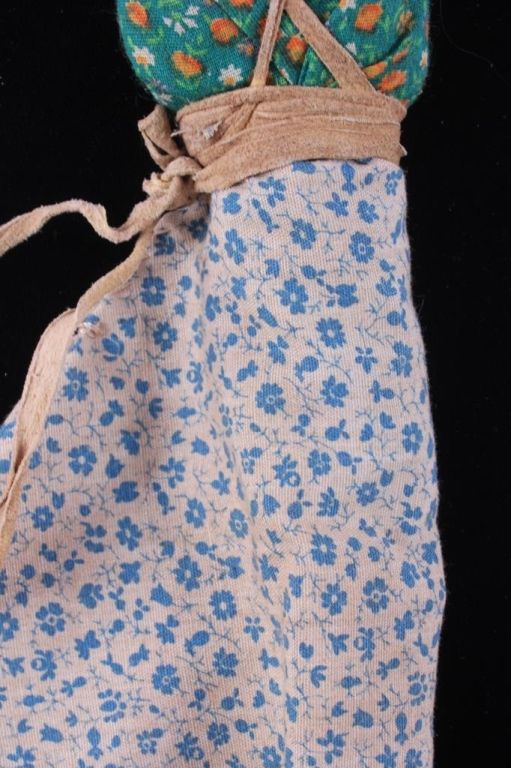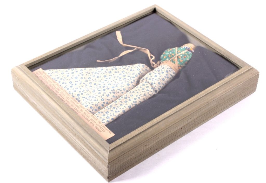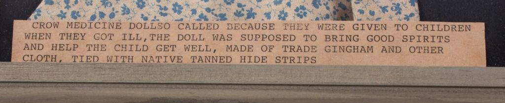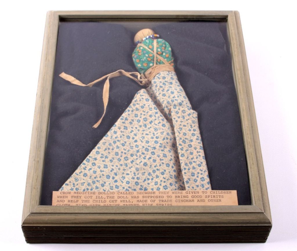 This is a framed Medicine Doll from the Crow Native American Indian people. The piece is described as such: Crow Medicine Doll, so called because they were given to children when they got ill. The doll was supposed tobring good spirits and help the child get well. Made of trade gingham and other clothe and tied with native tanned hide straps. The piece also has glass seed trade beads from the 1800's. The piece is in a wood frame andis from circa 1900-1930's. The frame measures 9.5" long and the frame measures 9"x11".