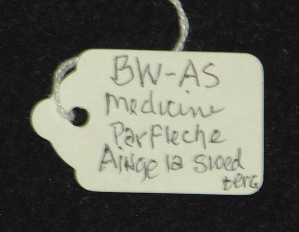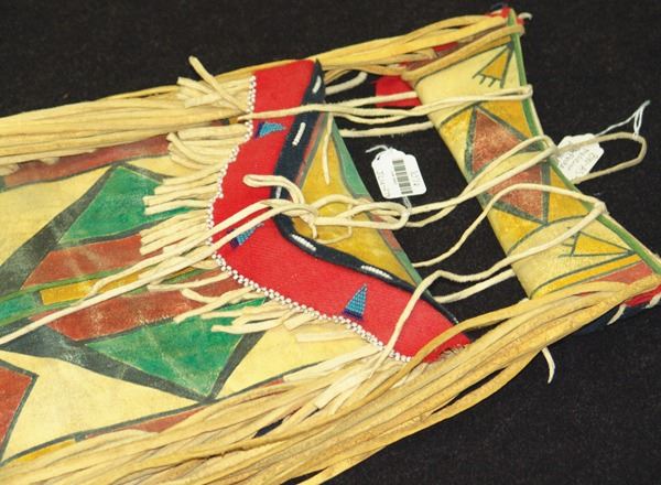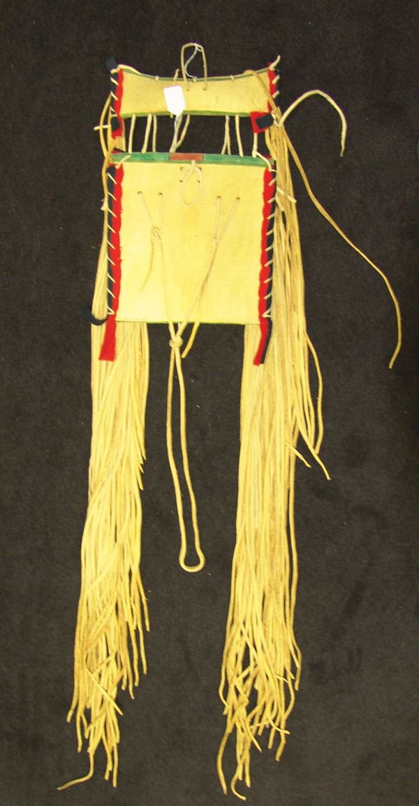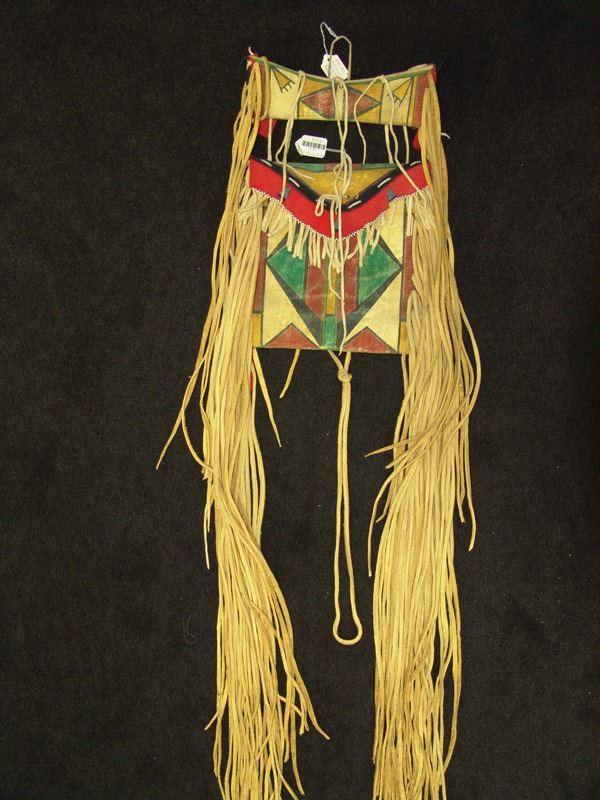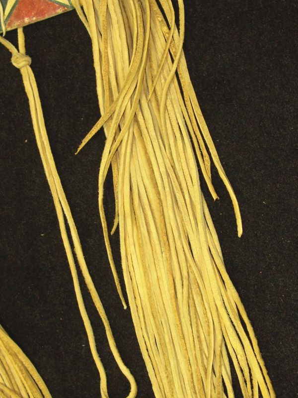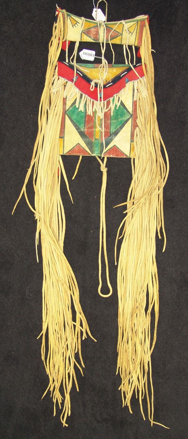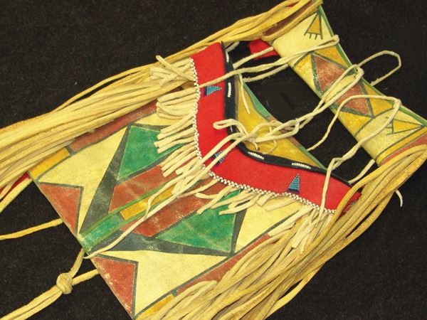 Outstanding, two-piece, shaped rawhide "medicine parfleche" with crisp, colorful, pigment painted geometric designs, and thick, extra-long, fringe. Excellent condition.Late 1900s11 x 10-1/2"