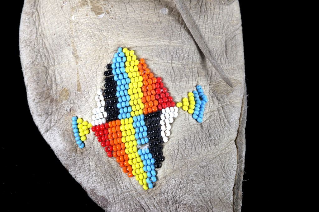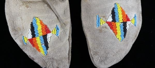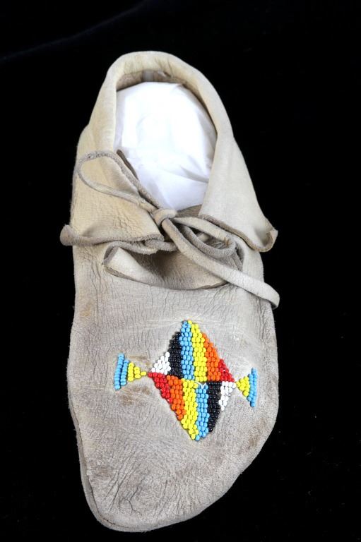 Featured in this lot is this pair of beaded moccasins from Crow Montana Indians, circa 1940's. The moccasins feature a beautiful Indian tanned hide construction with trade seed beaded toe section. The trade seed bead coloration features sky blue, yellow pumpkin orange, black, and medium red. The condition of this pair of moccasins is good, with some wear consistent with age. The measurements of this pair of moccasins are 2 1/4" x 3 1/2" x 9 1/2".