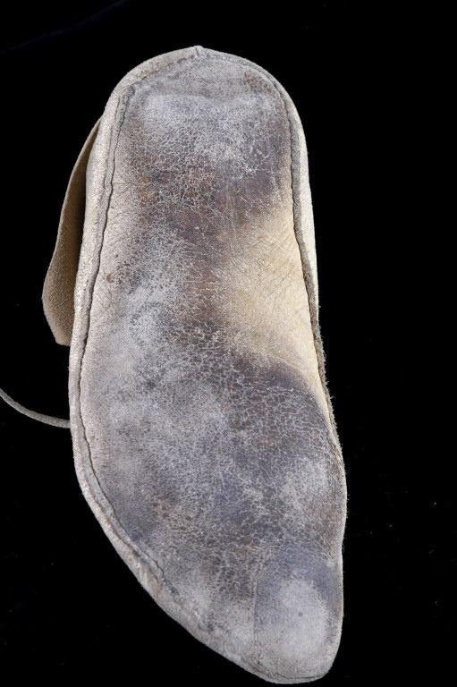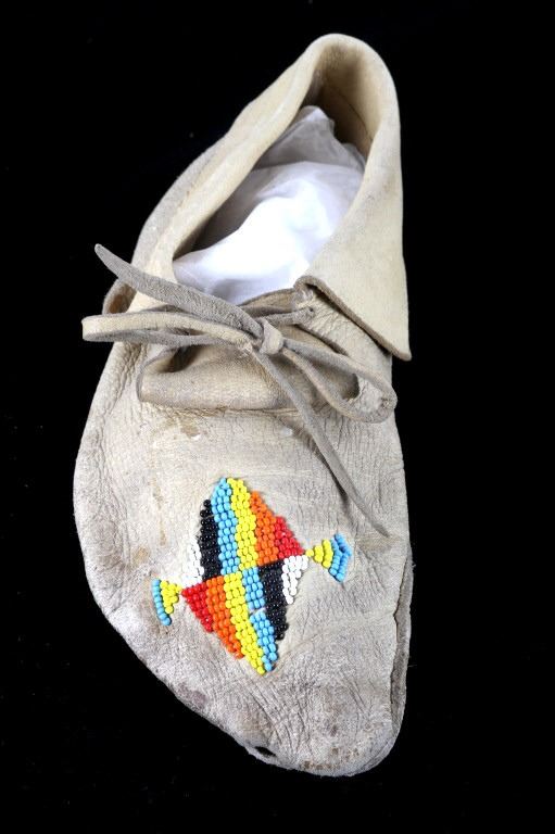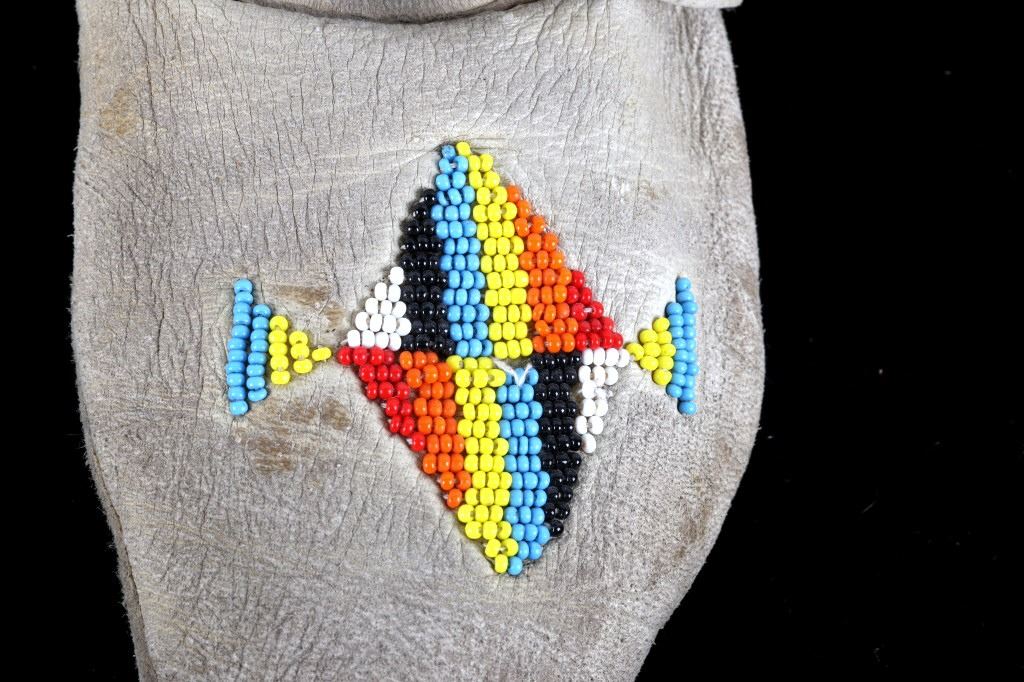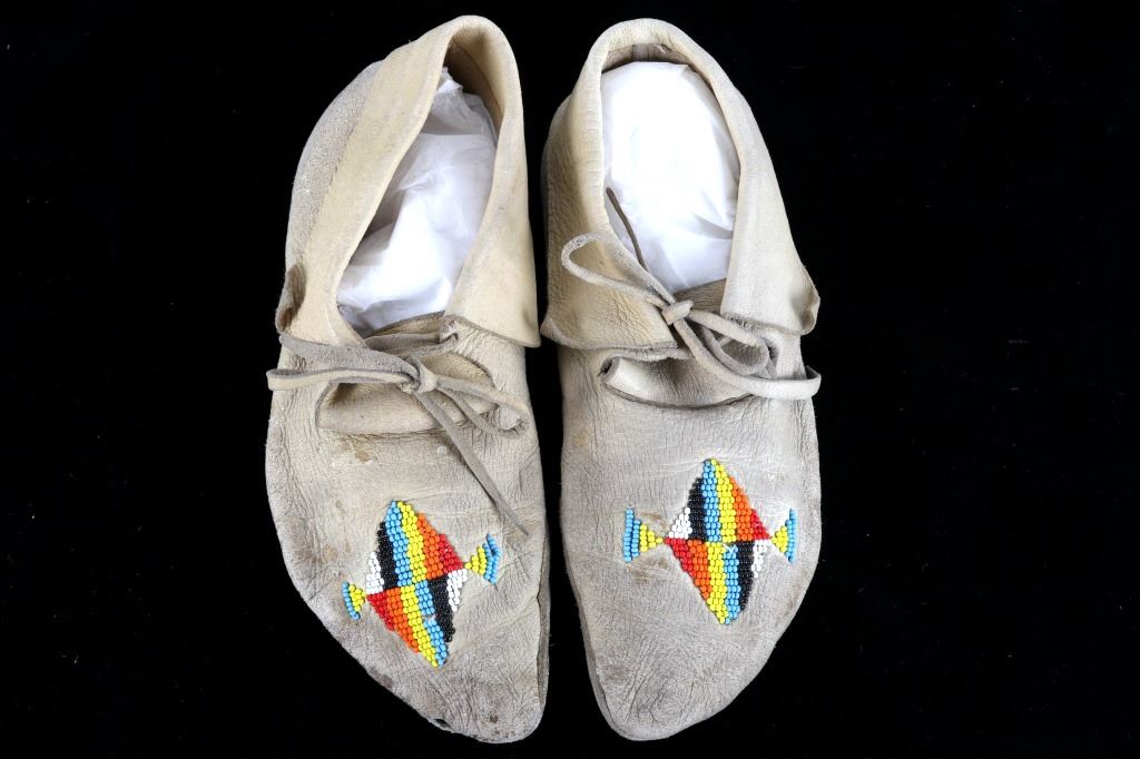 Featured in this lot is this pair of beaded moccasins from Crow Montana Indians, circa 1960's. The moccasins feature a beautiful Indian tanned hide construction with trade seed beaded toe section. The trade seed bead coloration features sky blue, yellow pumpkin orange, black, and medium red. The condition of this pair of moccasins is good, with some wear consistent with age. The measurements of this pair of moccasins are 2 1/4" x 3 1/2" x 9 1/2".