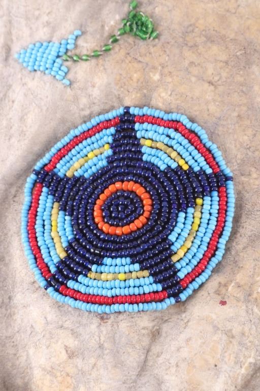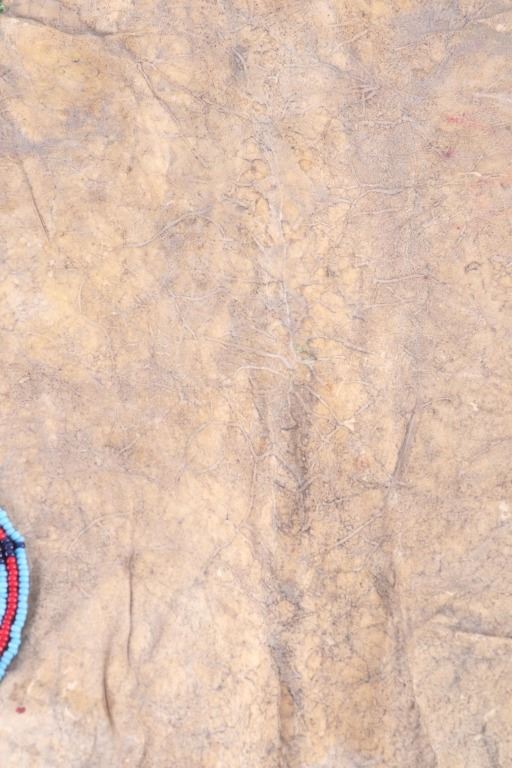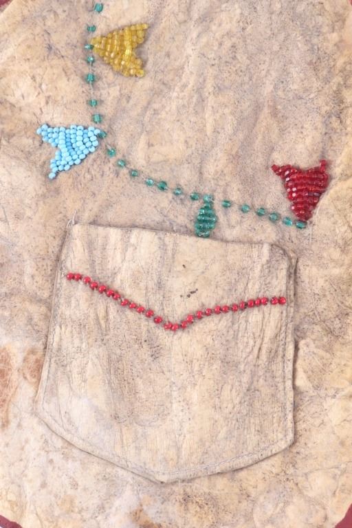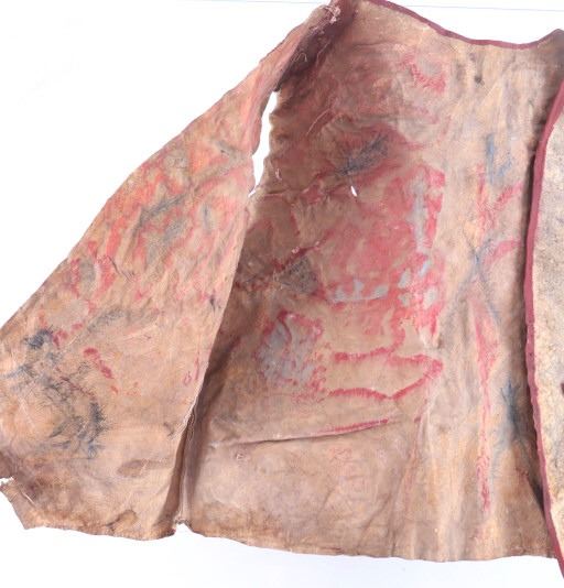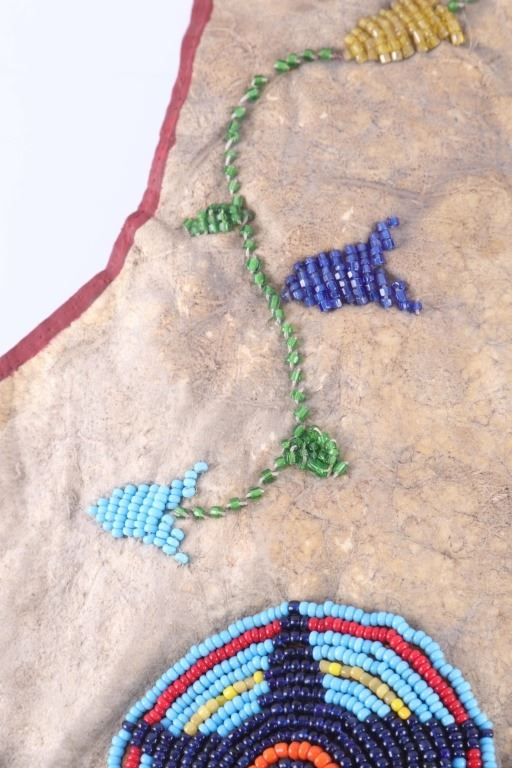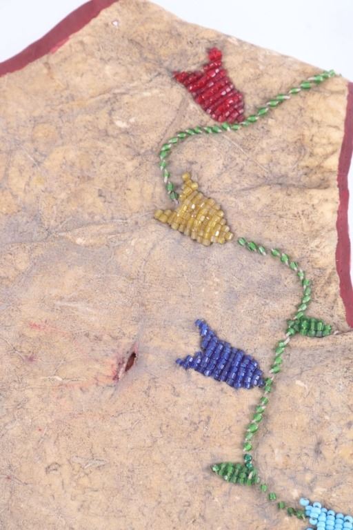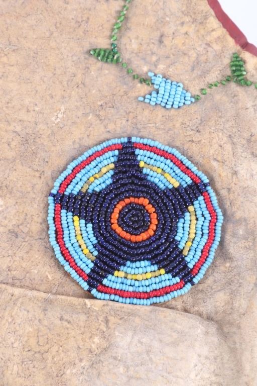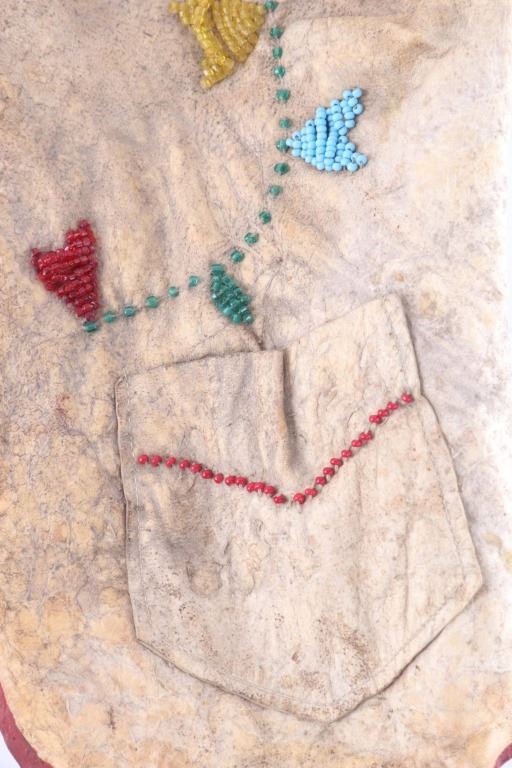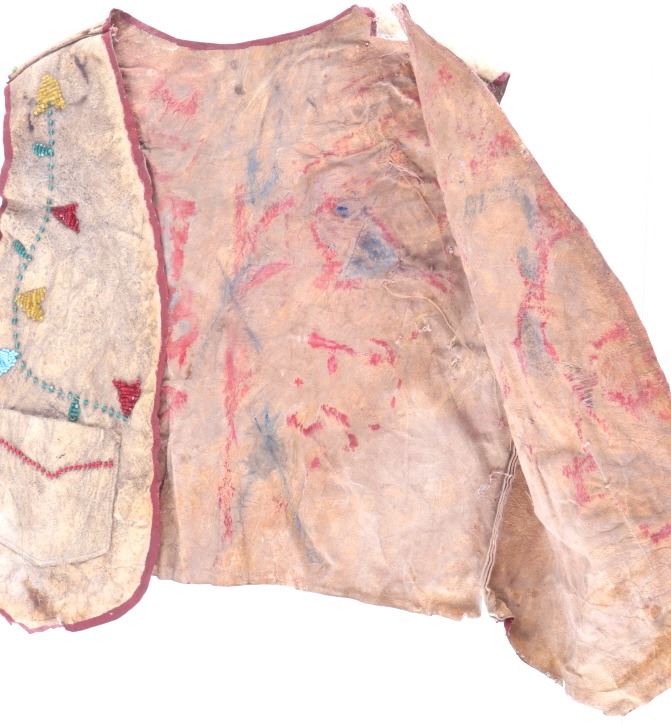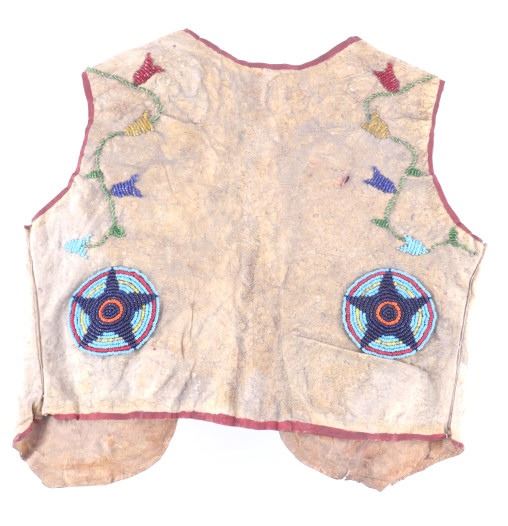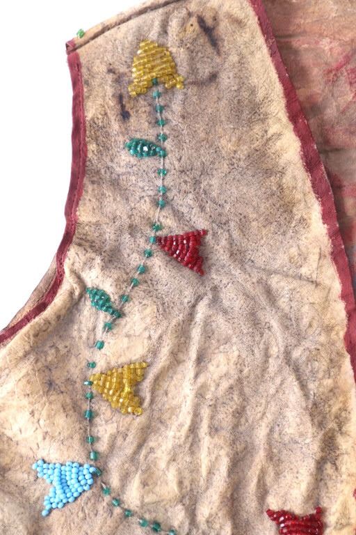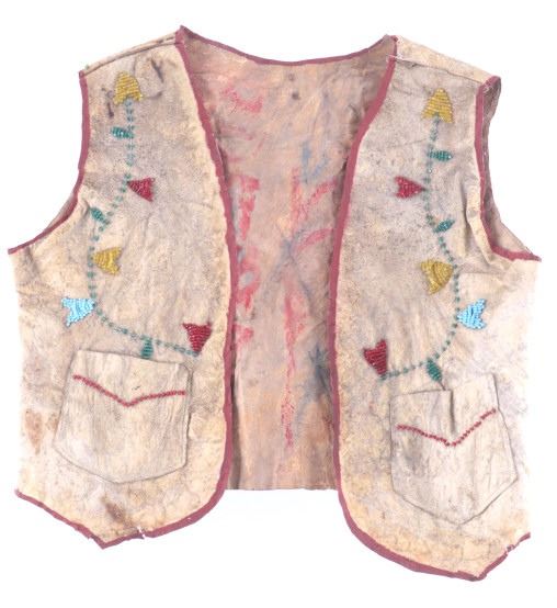 This is an outstanding Crow Native American Indian parfleche polychrome painted vest with beadwork, circa 1890. The piece is crafted from parfleche envelope remnants decorated with polychrome mineral pigment paints and beautiful geometric and floral glass trade seed beadwork. The beads are all original 19th Century examples in colors of faceted semi-transparent green, semi-transparent greasy yellow, sky padre light blue, red, semi-transparent red, cobalt, greasy yellow, and salmon/orange. The vest is sewn with sinew and trade thread and shows two rawhide pockets on the front and a red ochre/ocher painted border. Inside the vest is a polychrome pigment painted remnant design and symbols of tipis (teepee), horseback warriors, and more. The front shows the vine-like floral, arrowhead-like design, which flows over the shoulders on the back down to two round medallions with a five-point star and circle at the center. This is truly a fantastic early piece in well-preserved, slightly stiff condition. Provenance: From a large American Indian and Cowboy collection outside of Billings, Montana; it was purchased from an old South Dakota collection. When closed and flat, the vest measures 13.5" by 13.5".