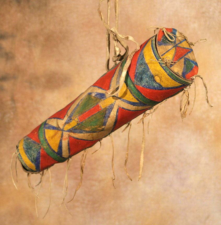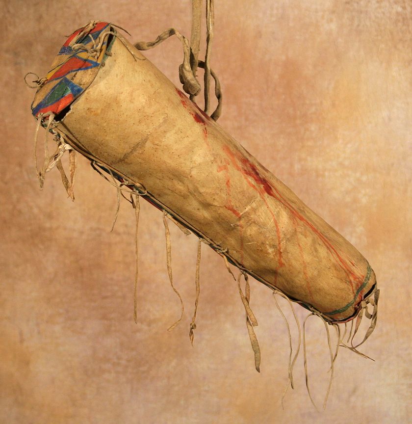Crow Parfleche Bonnet Case. 18" x 6" with good, bright colors & all original ties on sides, top & bottom. Circa 1890. (est. $2,000-3,000). CONDITION REPORTS: www.auctioninsantafe.com/docs/cr2012.pdf