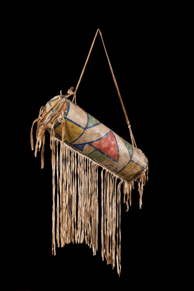 Cylindrical bonnet case, 16” long with 13” long fringe and 4 1/2” dia. Geometric polychrome design, c. 1880-1890.