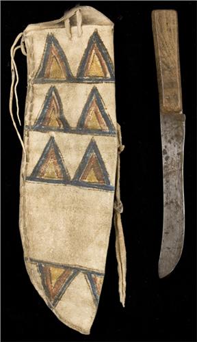 Crow Parfleche Knife Case. 15" long. Painted designs on parfleche. 19th century. Excellent condition. Contains skinning knife marked "Thomas Nilson Sheffield England". (est $2,000-3,000)
