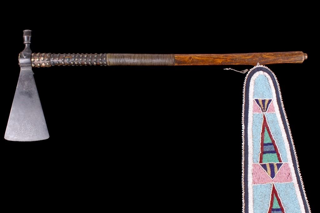 This is an exceptional 19th Century pipe tomahawk from the Crow Native American Indians of Colorado. The piece is from the personal collection of noted tomahawk historian and collector, Ben Thompson of Missouri and was noted as being one of his favorite pieces. The piece was then later sold to collector and noted dealer Tom Hardy. This shows a hand-forged iron blade that was forged from a gun barrel, with the rifling still visible inside the pipe bowl, which appears to be a hand cut with eight grooves rifling. Under the bowl, which shows two rings, is a large filed chevron and a wide triangle-shaped typical western-style blade and small rear-facing spur on the inside edge. The solid wood haft is adorned with various sized brass tacks, which are all solid brass period correct 1800’s square shank, along with a high-relief carving at the fore end or smoking tip, an old tarnished copper telegraph wire wrapping and a long fringed and beaded pendant drop. The drop is likely a later addition, from circa late 1800’s, but in itself is quite early and dresses up the piece nicely. The piece is held onto the pierced hole with a bit of Indian tanned hide and shows a red and blue early trade clothe construction with inner Indian tanned hide lining and traditional geometric pattern. The beads are all period correct 19th Century and show chalk white, greasy yellow, sky padre blue, Cheyenne pink, semi-transparent red, cobalt, semi-transparent medium blue and medium green. The outside edge shows a fancy beaded section of large glass trade pony beads. The fringe is long and shows a slight dry condition, which overall displays well and is in good condition with the drop showing only very minimal to no bead loss. This is truly a large, heavy and authentic Plateau region pipe tomahawk of the Indian Wars period with terrific patina and nice art appeal. From the Ben Thompson and Tom Hardy Collections. The tomahawk measures overall 25 ½ inches showing a 10 inch long head that has a 4 inch wide blade across the bottom edge. The beaded drop measures 6”W x 14”L with an additional 18”L fringe (together measures 32”L and with the tomahawk is 52”L).