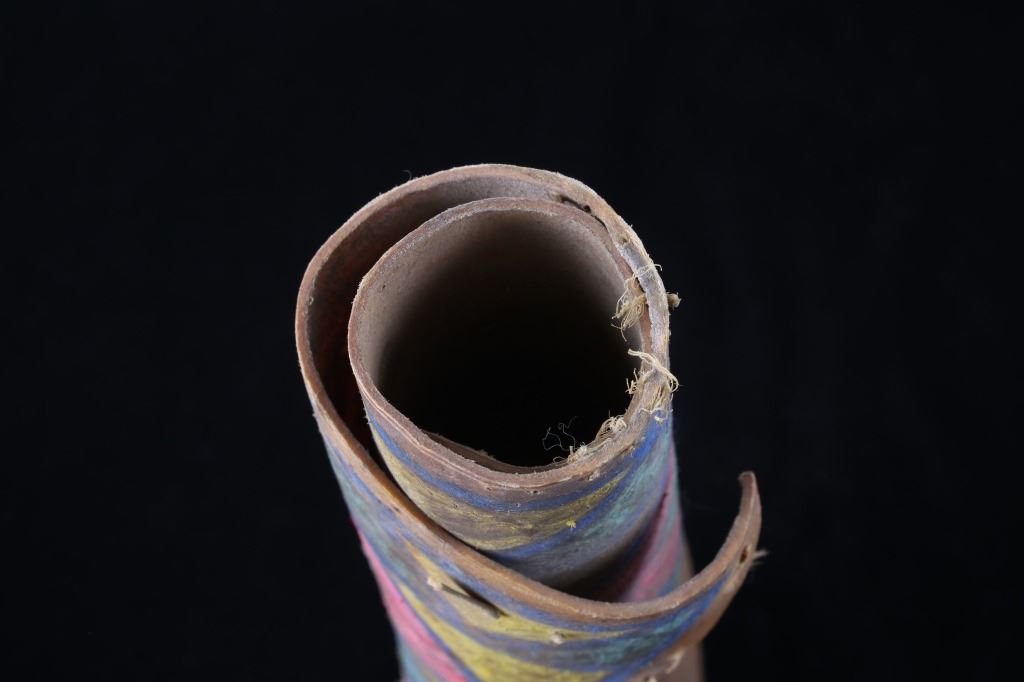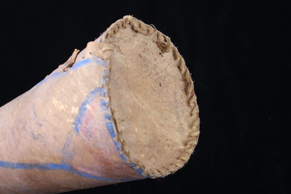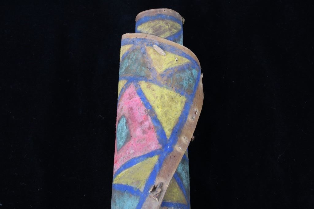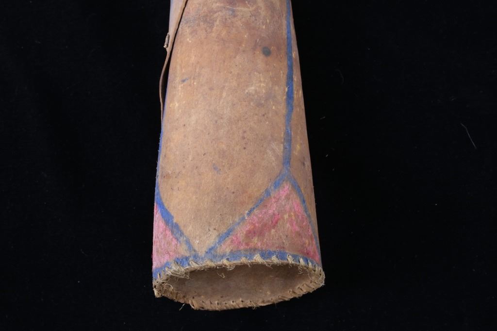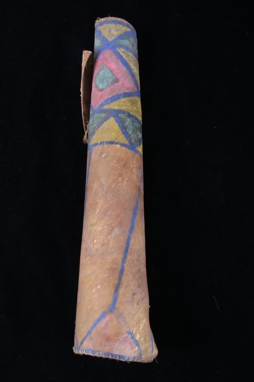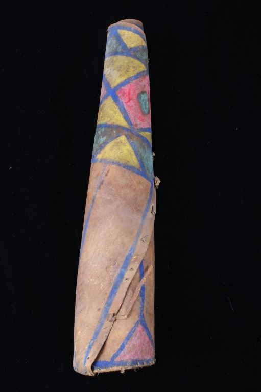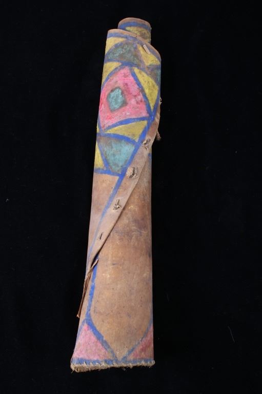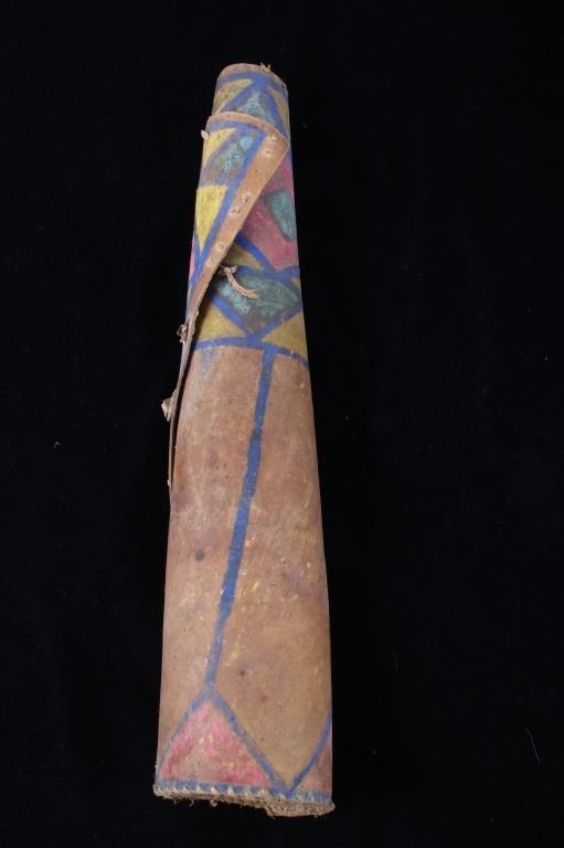 Offered for sale is this fine polychrome painted parfleche rawhide headdress case from the Crow Native American Indians dating to the 19th Century. The case shows a parfleche rawhide cylindrical design with hide sewn seem and round parfleche bottom with sinew sewing. The case shows traditional geometric painting in colors of blue, red, green, and yellow. The case has a thick Buffalo hide and is truly an authentic Indian Wars era parfleche piece unlike the thinner parfleche examples made for the tourist trade. A cylindrical case such as this would have held a feathered Chief’s or elder’s headdress for protection. Provenance: From a historic Eastern Montana American Indian Collection, where the piece was found to be an authentic original, one of the finest collections of American Indian weaponry and antiquities in Montana. Measures 16”L by 3.5”W.