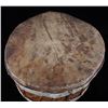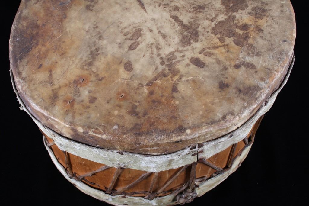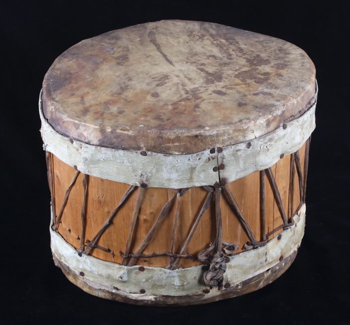 For your consideration in this lot is a Apsáalooke (crow) rawhide one piece log drum. The piece features stretched deer rawhide on both sides of the wood body with rawhide sinew ties over the wooden frame. The drum shows fair condition overall. The drum measures 10 1/2" tall with a diameter of 13".