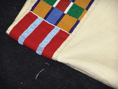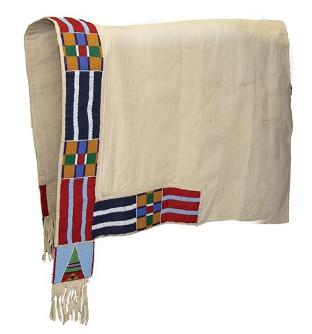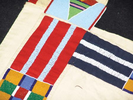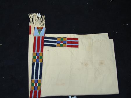 Circa Late 1900s, Classic design heavy saddle blanket with beautiful beaded trim done with traditional Crow motif on red and indigo tradecloth. Excellent condition. (Matches above two lots and lots #647 and #655.) 33" x 58" From the Johnson Collection.