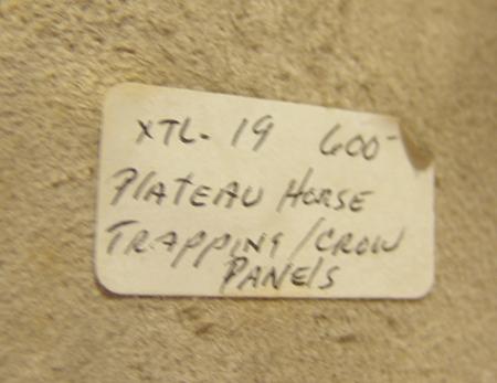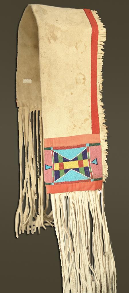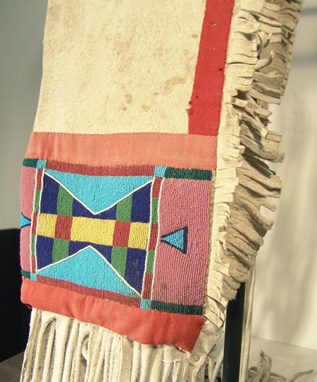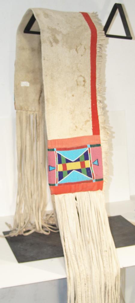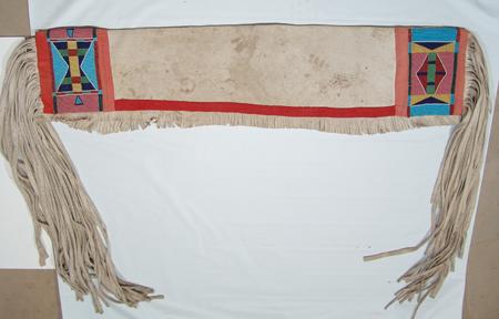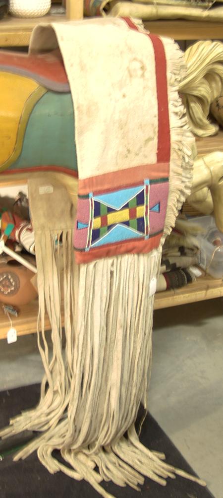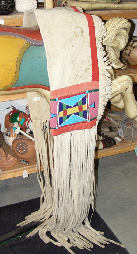 Beautiful white buckskin saddle drape with large beaded panels at each end and long fringe. Purchased from Pueblo One in 1976 for $630; appraisal value $1500. Condition: excellent. 50" x 10"