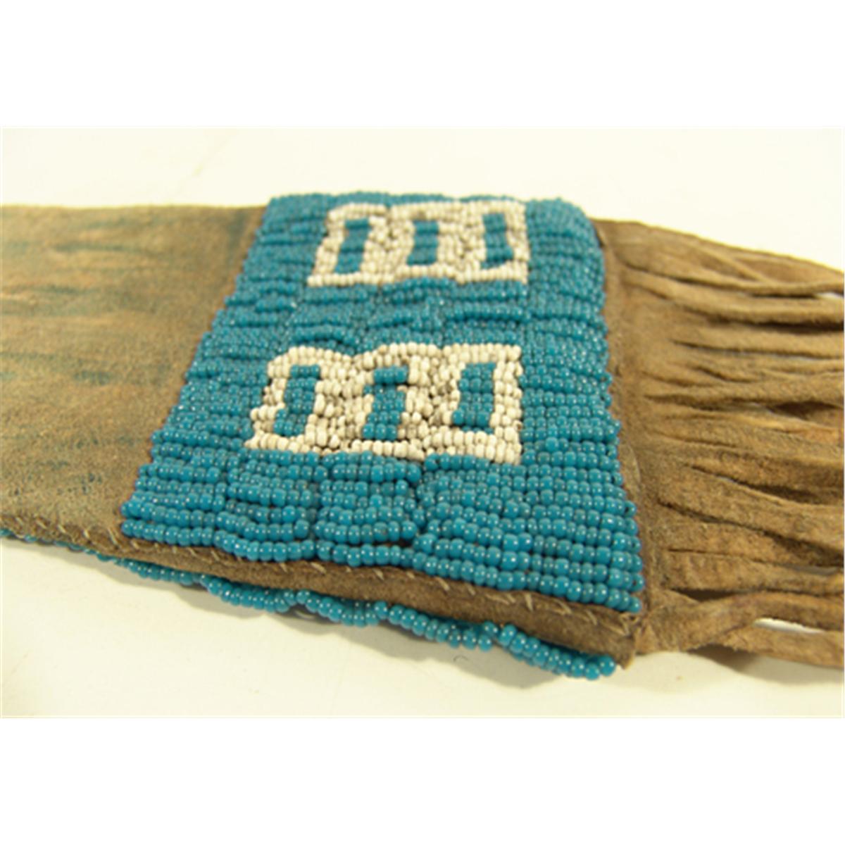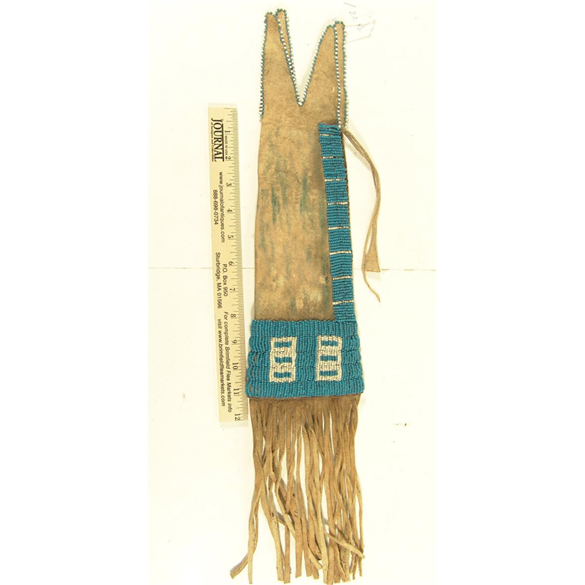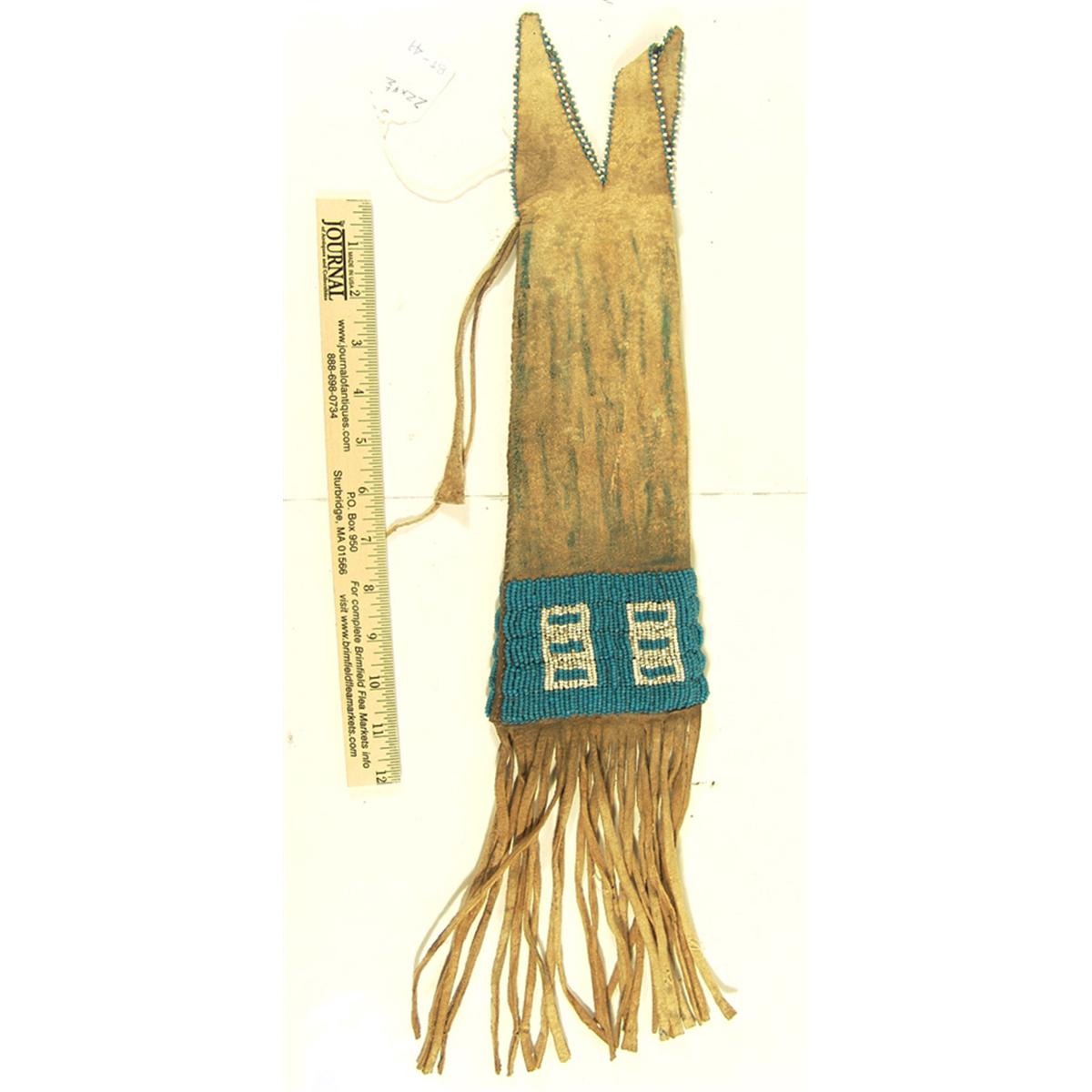 Tapered buckskin pipe/tobacco bag with lazy stitch beaded design done with pony beads, long fringe, and some green ochre. Condition: very good. 22" x 4-1/2"