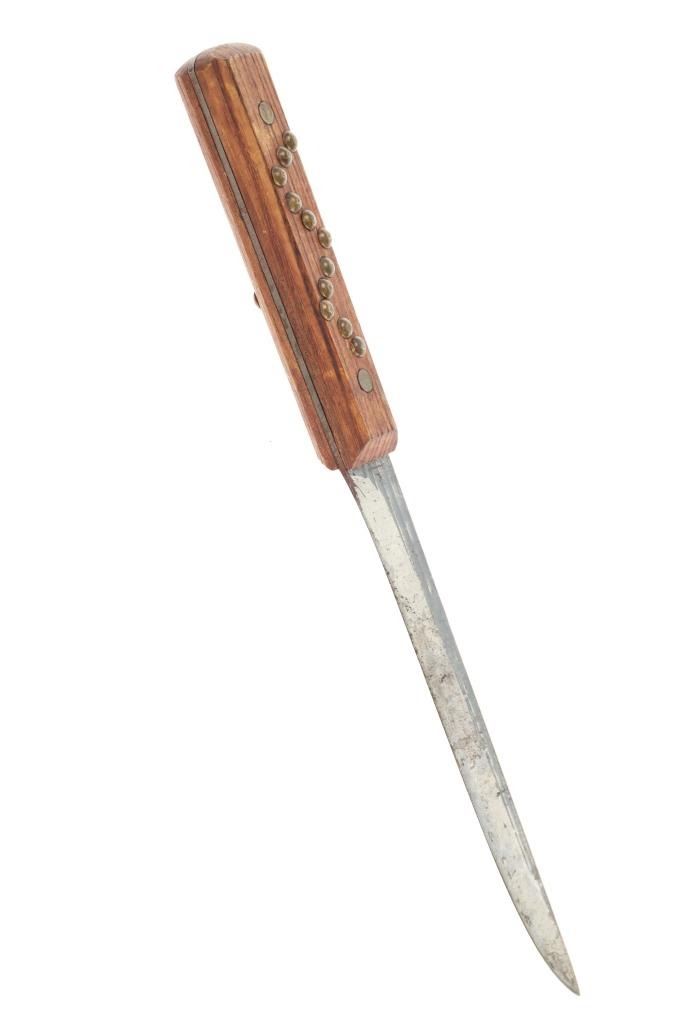 The lot features a thick harness leather sheath with large brass metal tacks paired with a Forgecraft vintage knife. The Crow belt sheath has brass metal tacks with belt loop back cutout and red dyed edge. The knife has a Forgecraft Carbon stamp and linear stamped back spine having brass metal tacked zig-zag and cross like patterns. Sheath and knife together are 12.25"L by 4"W. Knife is 10 7/8"L by 6.25"L blade.