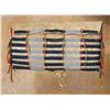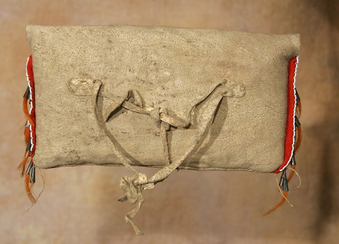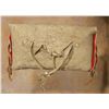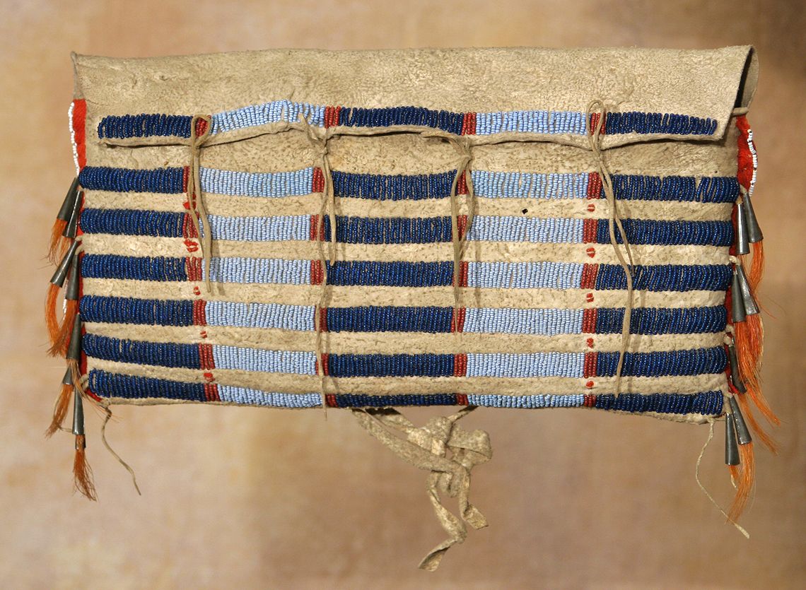Crow Teepee Bag. 9" x 14" with rows of white-heart red, translucent blue & light blue beads. Edged in cloth with white beaded trim & tin cone accents with horsehair tassels. Circa 1890. (est. $2,500-3,500). CONDITION REPORTS: www.auctioninsantafe.com/docs/cr2012.pdf