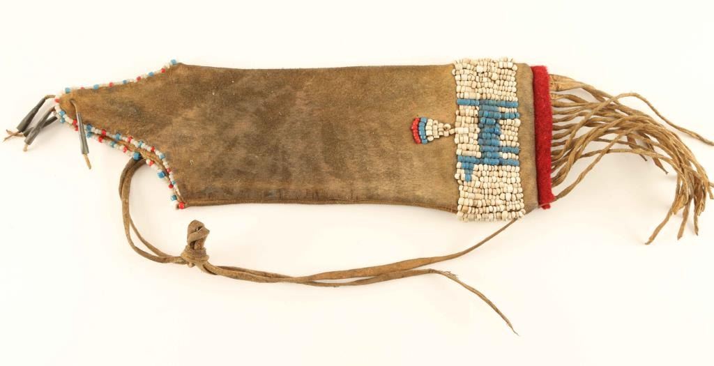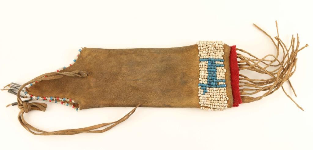 Leather pouch accent with dog effigy in blue and white glass beads accented with fringe. Measures 12"X3".