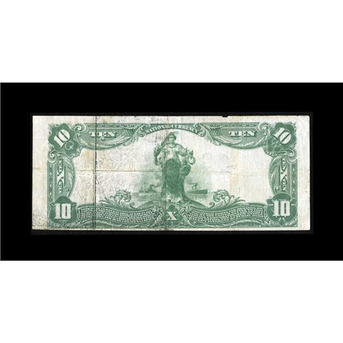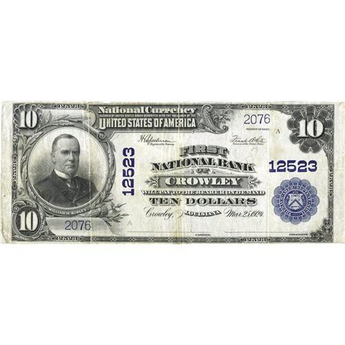 <B>Crowley, LA</B></I> - $10 1902 Plain Back Fr. 635 <B>First NB</B></I> Ch. # 12523<BR>This bank was chartered in 1924 and began its issue with the $10 and $20 Plain Backs, of which a total of 19 are now documented with the addition of this, only the fourth $10 Plain Back to surface from here. The note is quarter folded and has a tiny chip in the upper margin, but retains considerable crispness for the <B>Very Fine</B></I> grade. This may have been carried as a treasured wallet keepsake, as the folds are a tad on the heavier side and there is a band of apparent wallet soiling on the back. Overall, it faces up quite nicely and would make an attractive addition to any Louisiana collection.