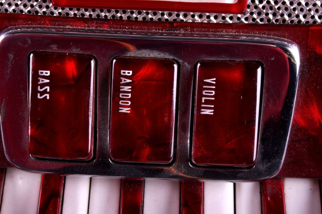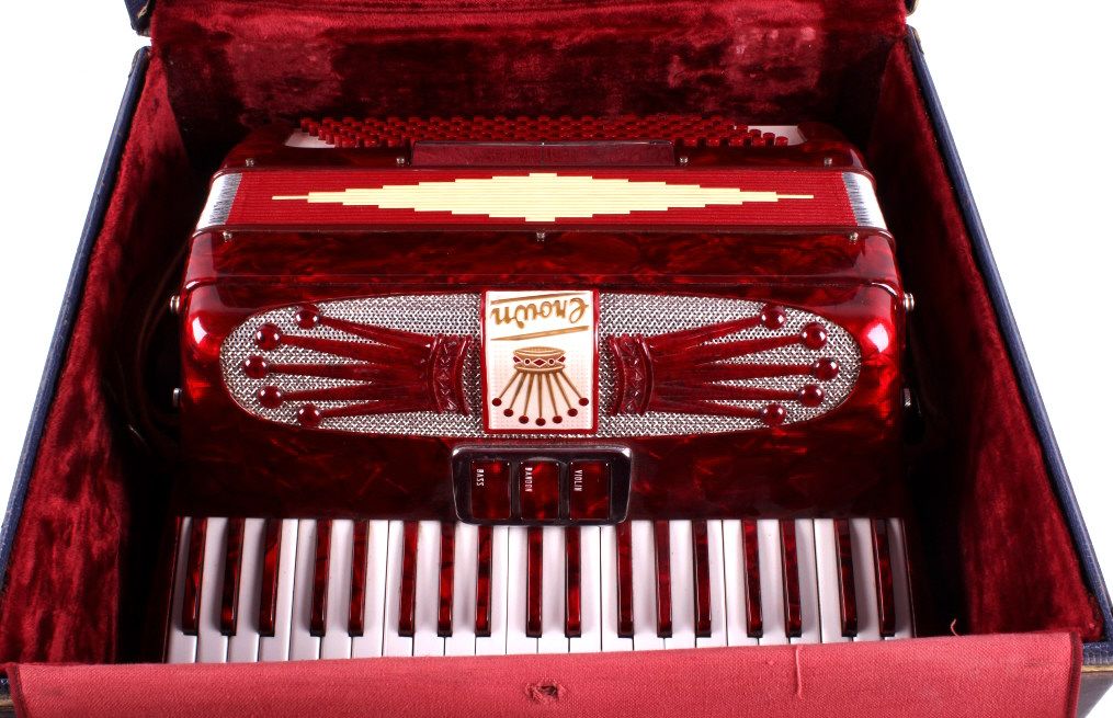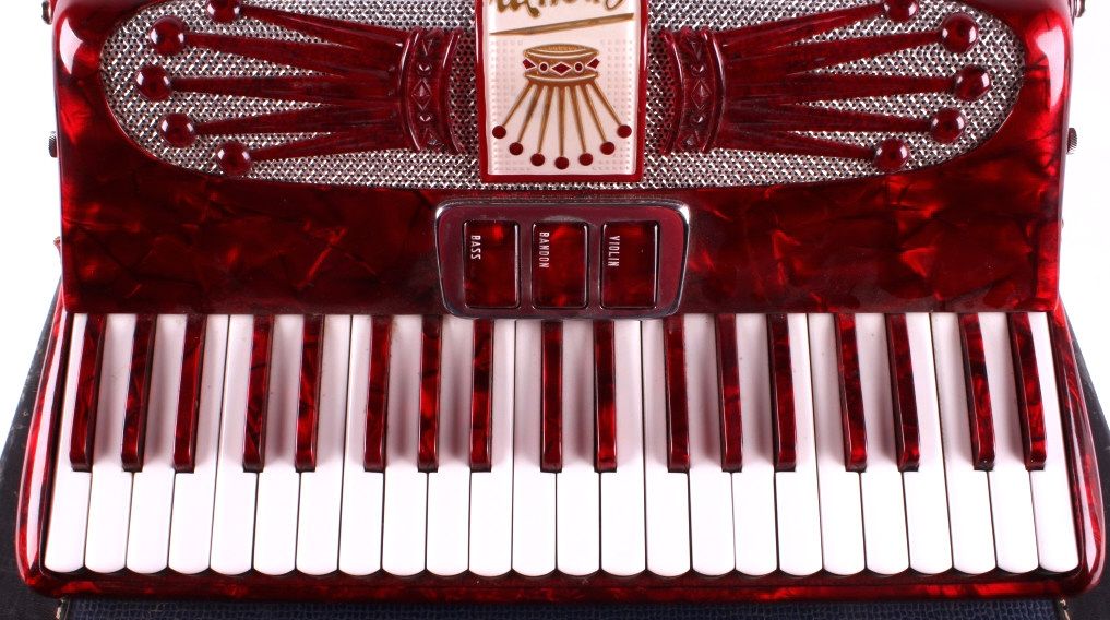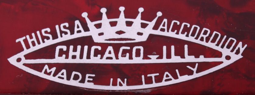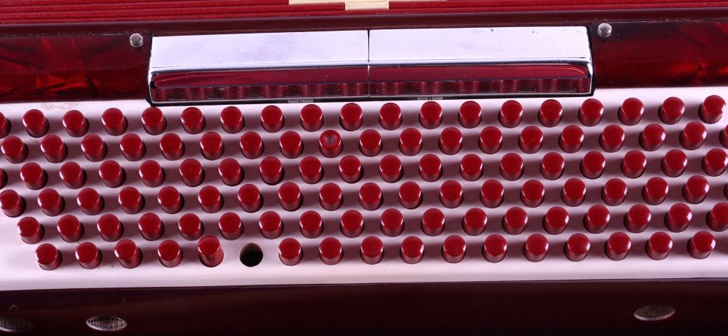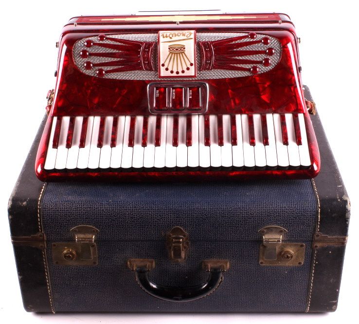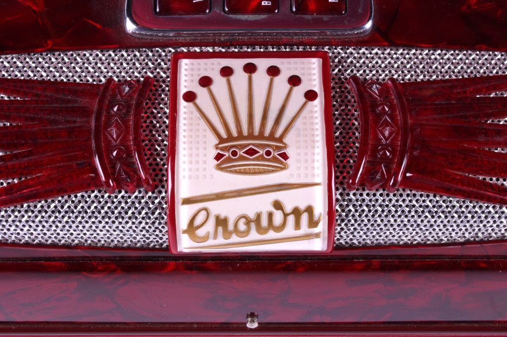 This is a crown accordion with case. The accordion has 25 keys and 120 bass buttons, one is missing. The bellows are intact with no visible damage or leaks. The accordion is in very good condition. It measures 15" x 15" x 7".