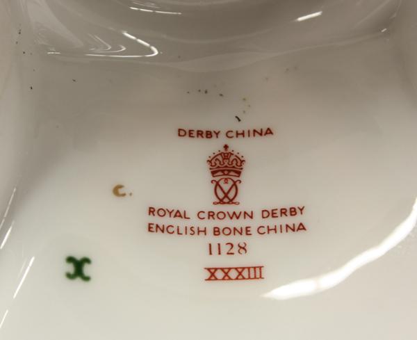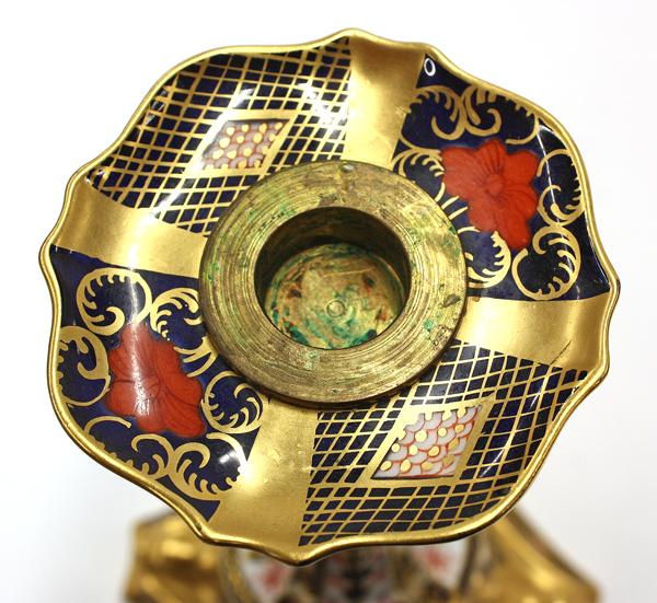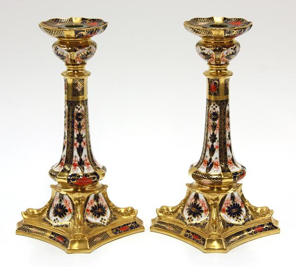 (Lot of 2) Royal Crown Derby ''Old Imari'' porcelain candlesticks pattern 1128, having a gilt, cobalt and crimson decorated body on a white ground and rising on a graduated plinth, XXXIII marked on base  each 10.5''h