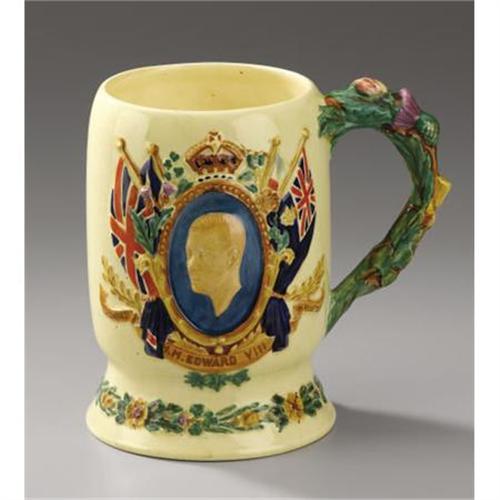 <B>Crown Devon Fieldings Edward VIII Ceramic Abdication Mug</B></I><BR><I>1936</B></I><BR><BR>One side depicting the portrait of Edward VIII below the Royal crown, surrounded by flags of the commonwealth and the Union Jack, the reverse with crown and inscription <I>Long May He Reign </B></I>above the lyrics for the National Athem, and the abdication date of December 10th 1936, the spreading base with floral garland, the handle decorated with oak leaves and flowerheads-6 ¼ in. high<BR><BR><b>Shipping:</b> Requires 3rd Party Shipping (<a target="_blank" href="http://www.heritageauctions.com/common/shipping.php">view shipping information</a>)