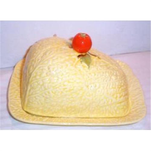 This wonderful Covered Cheese Dish is painted a wonderful yellow and has a great orange tomato finial. The covered cheese dish is in SUPERIOR condition with no chips, cracks, dings or hairlines and it measures 6" long by 5" wide and is about 7.75" tall. It is marked on the bottom with the familiar Crown Devon Logo.