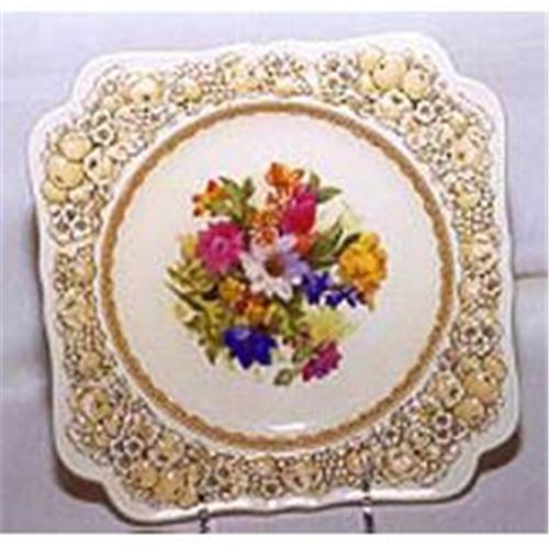 Crown Ducal plate in Florentine pattern having raised fruit and floral pattern around outer section of plate and colorful flower grouping in center. Their are 5 plates available.