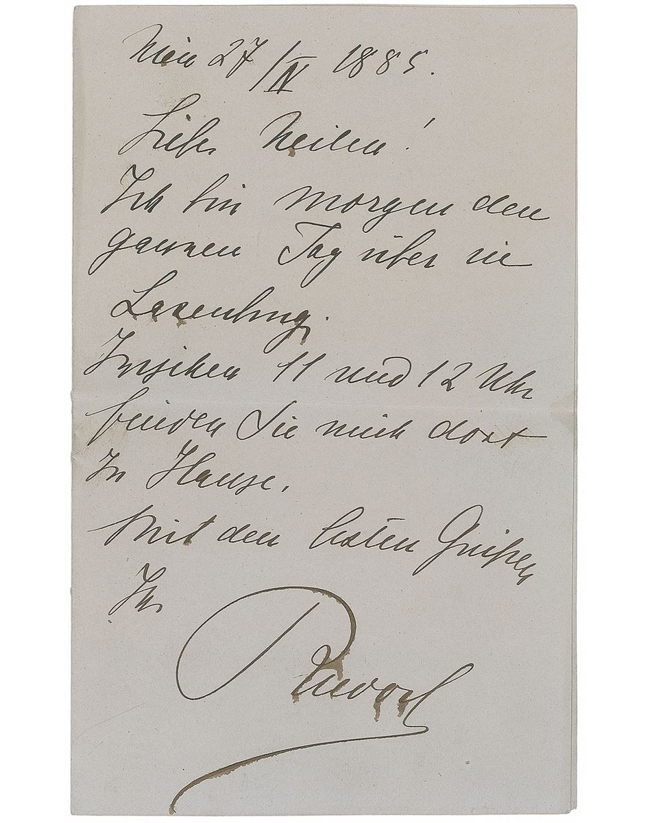 ALS in German, signed “Rudolf,” one page, 4.5 x 7, April 27, 1885. Letter to the writer Joseph von Weil, head of the German editors of ‘Kronprinzenwerks.’ In full (translated): "I am tomorrow all day in Laxenburg. Between 11 and 12 o’clock you will find me there at home.” In fine condition, with spreading to ink in his signature.
