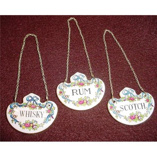 Three Crown Staffordshire Bone China, Gold Trim Decanter Tags. Whisky,Scotch,Rum.Thank you!