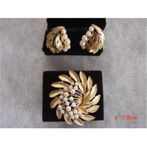 <tr><td>Title:Crown Trifari Brooch Earrings Rhinestone Pearls</td></tr>