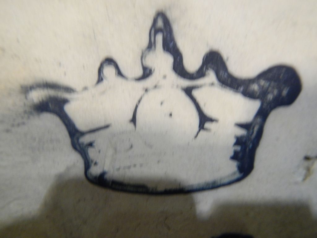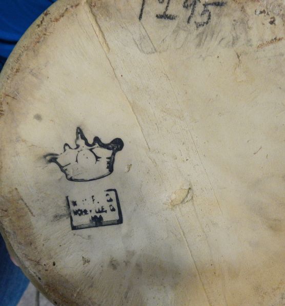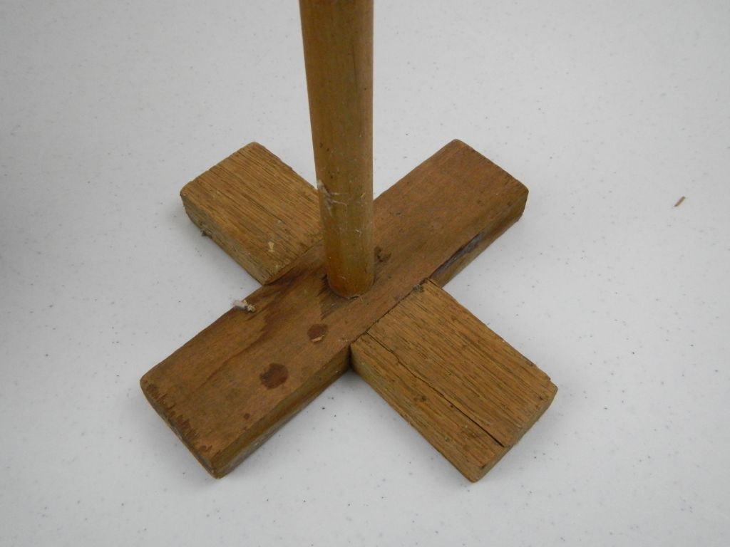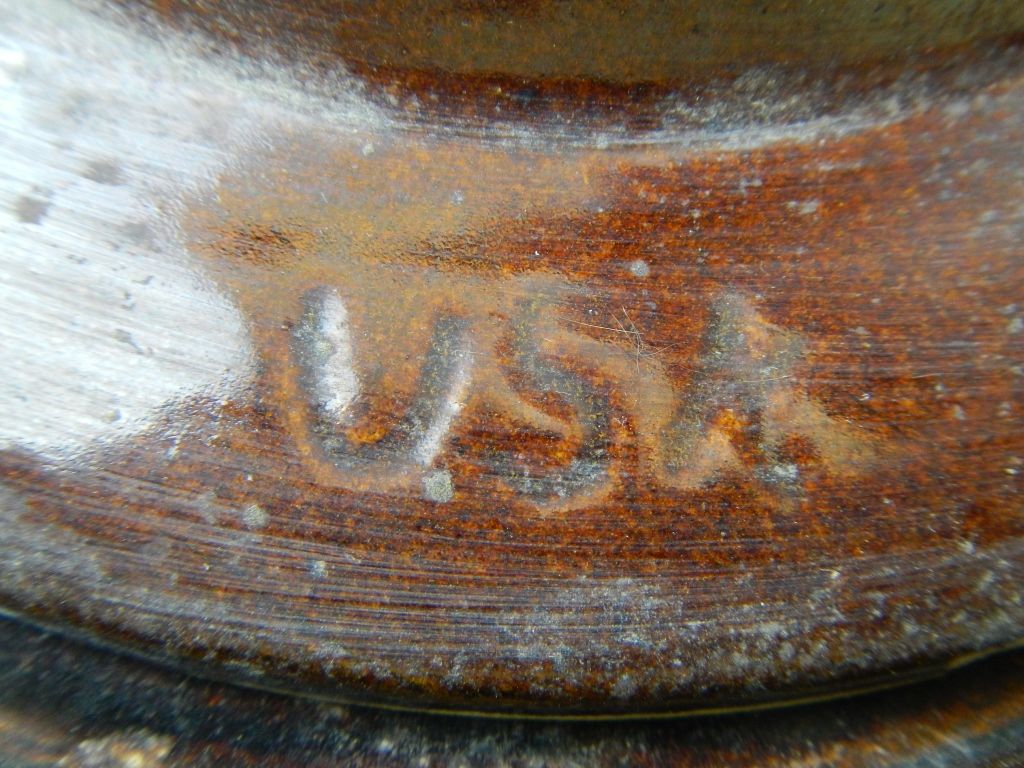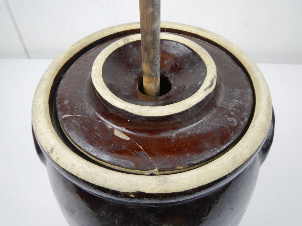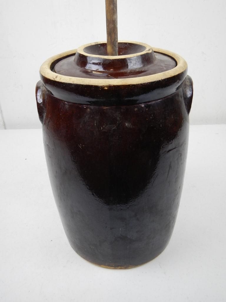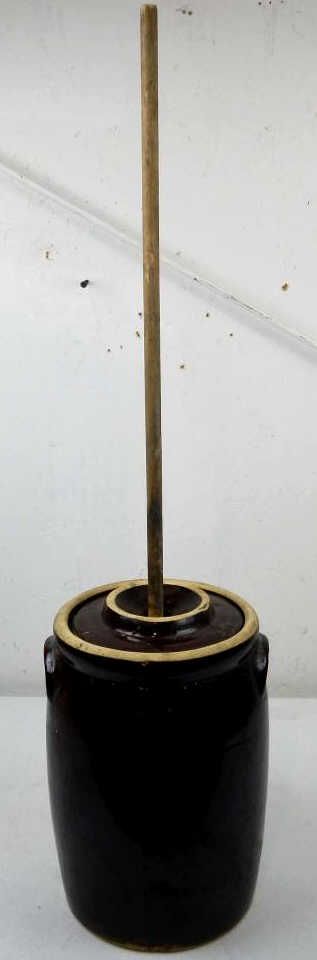Crown USA Butter Stoneware Churn - This is a brown Stoneware butter churn with the lid and wood handle. The lid has a repair and is stamped USA. The Bottom of the crock shows a crown logo. Measures 14" tall.