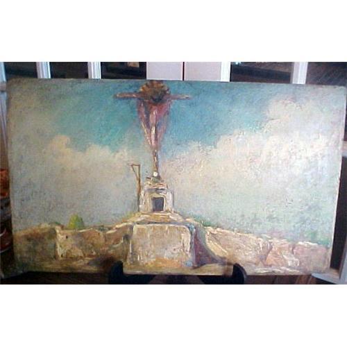 </font></strong>This very interesting painting was painted in 1907 at the Magdelena-Vieja, about 3 miles West of Lima, Peru. It depicts on of the shrines found throughout South America known as Cruce de Mayo, so called because of the custom of changing the draperies on the arms of the cross in the first week of May. The white dot at the foot of the cross is a skull. It was apparently fairly commonplace to find skulls, and it was customary to place them at the foot of the cross. The hole at the bottom was to burn candles. The gibbet to the left of the cross was for hanging a lantern at night. This information is taken from the typed page affixed to the verso and signed by the artist. Unfortunately, I cannot make out the name of the artist. The painting is on a wooden board with beveled edges in the back. It has been cleaned of surface dirt, but otherwise untouched. The size is 18" by 11". It is in fine condition. There is a slight bow in the board.</font>