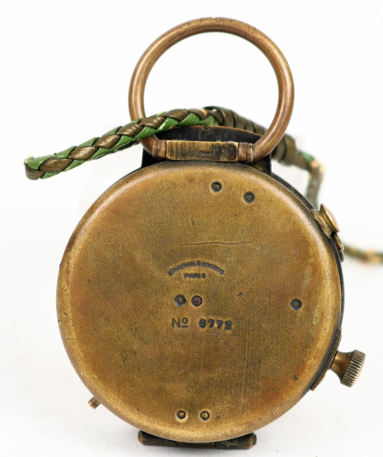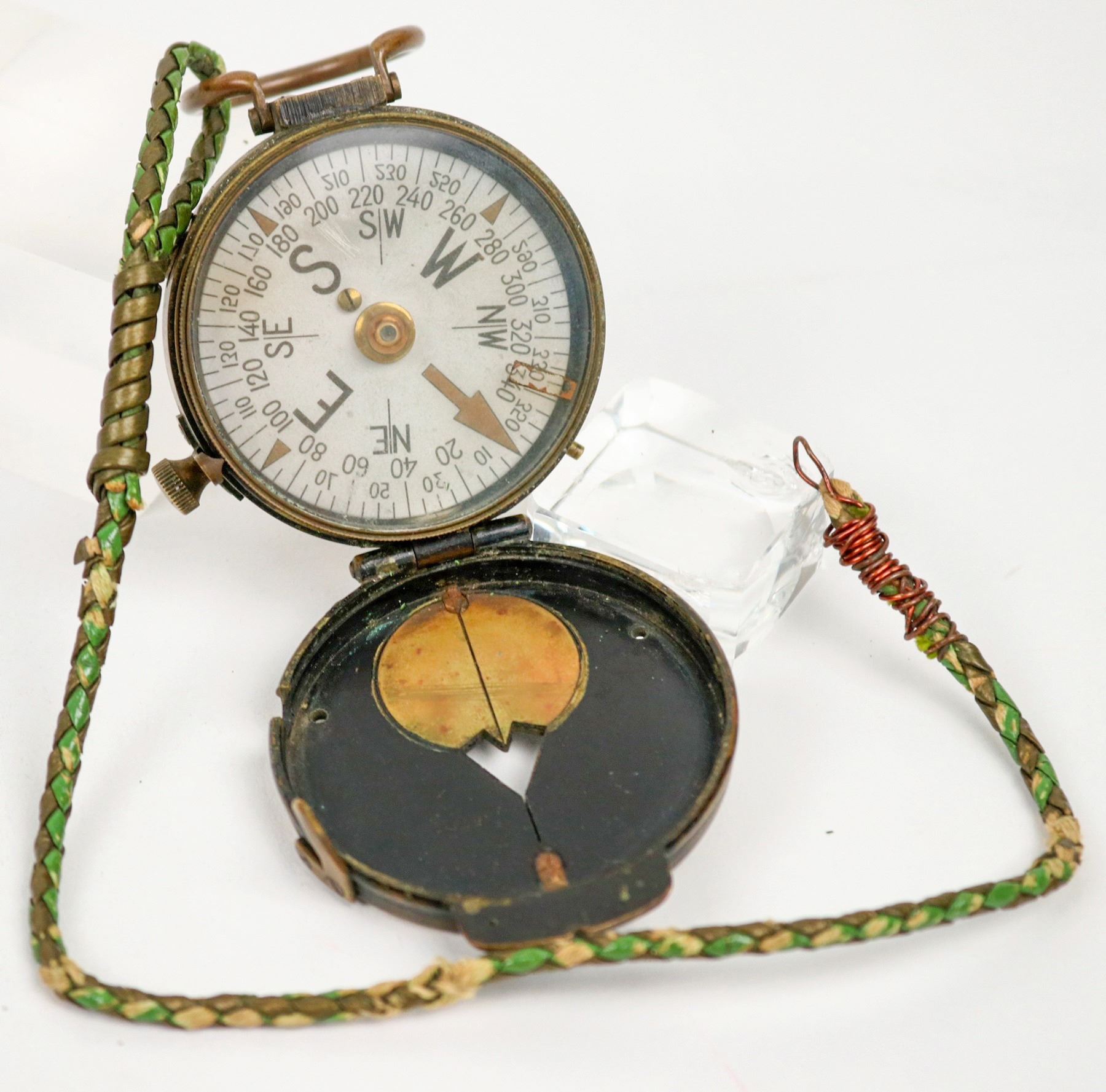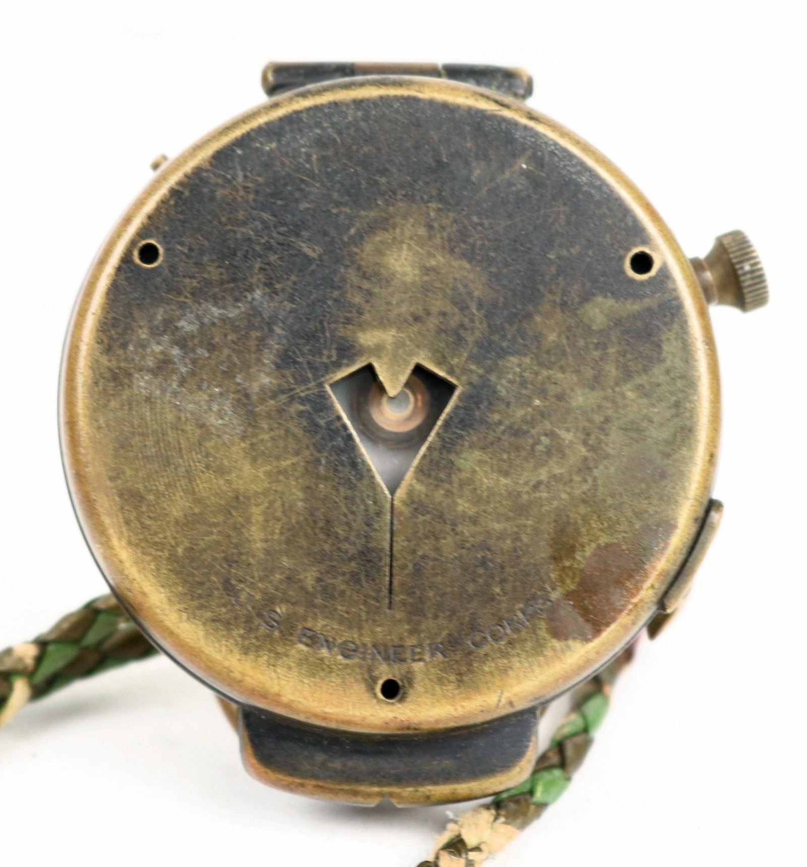 This is a WW2 vintage Cruchon & Emons military compass. Marked "US Engineering Corp." on the cover. The lanyard is handmade indicating a real life survival carry. Patinated with soft color edges indicate everyday usage. In working order. S/N 8772. 2.0 in. diameter. Please see photo for details.