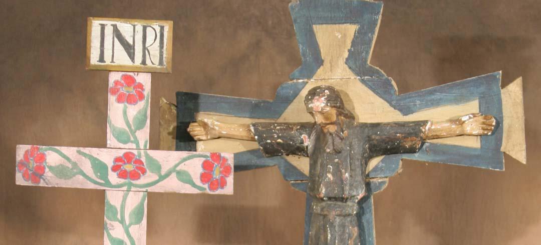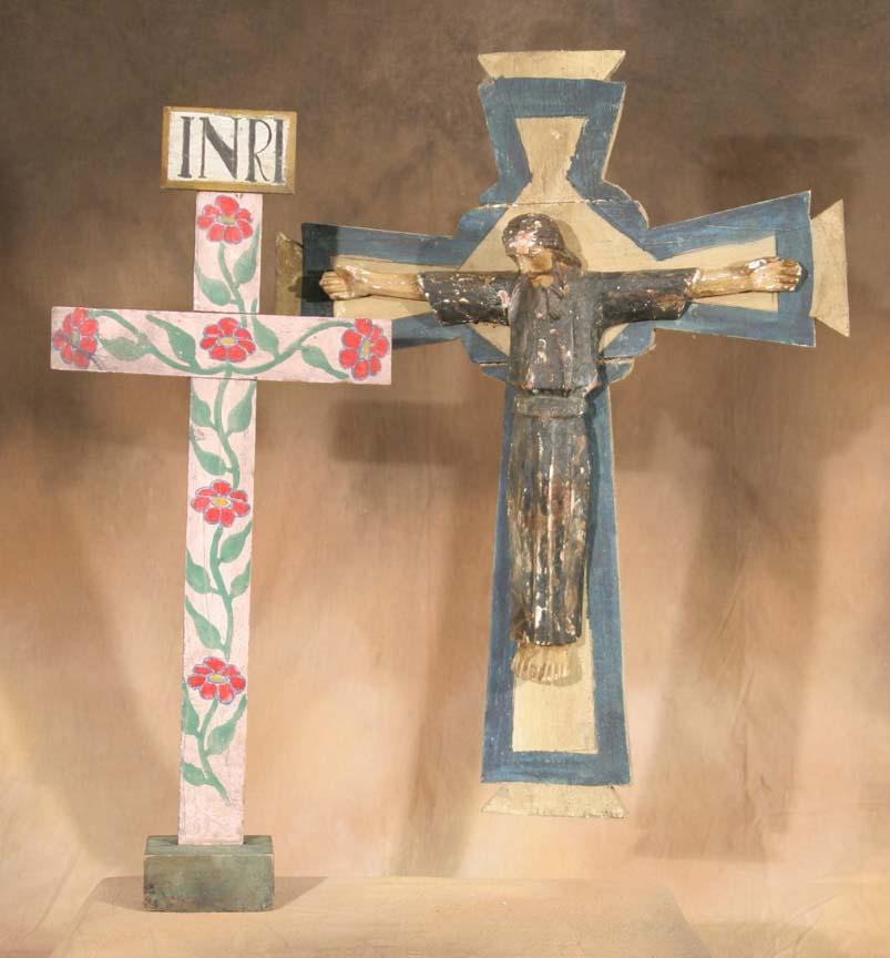 Crucifix & Home Alter Cross. 32" wood cross with hand carved wood Christo, gesso covered and painted. Together with a 30" hand painted wood alter cross. Circa 1920. (est $500-800). Additional Info: Collected in San Louis Potosi, Mexico. For condition reports please visit: www.auctioninsantafe.com/cr2011.pdf