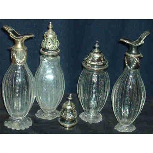 Too beautiful to throw away but one bottle is missing and the others have seriously damaged bases although the body of each is intact. Salt, Pepper, Mustard, Oil, Vinegar tops with fabulous repousse work and piercing. Swags and flowers. Opening size of salt and pepper tops is 1.1/8". Opening size of Mustard jar is 1.3/4".