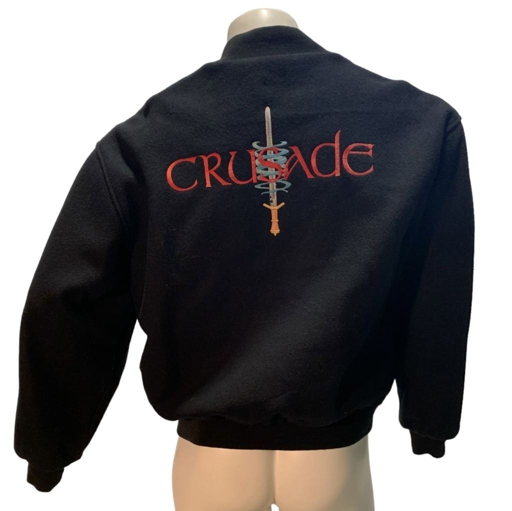 Original jacket given to the cast & crew on the science fiction television series 'Crusade' (1999), a spin-off television series from J. Michael Straczynski's Babylon 5, set in 2267, five years after the events of Babylon 5, and just after the movie A Call to Arms. The Drakh have released a nanovirus plague on Earth, which will destroy all life on Earth within five years if it is not stopped. The Victory class destroyer Excalibur has been sent out to look for anything that could help the search for a cure.