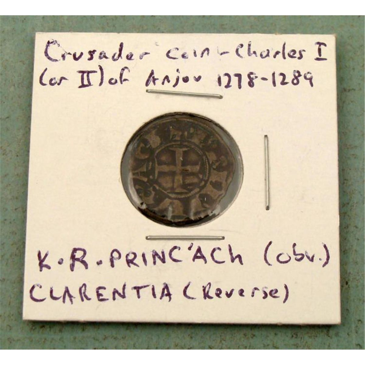 Crusader Coin * Era: Charles I or II of Anjou, 1278-1289Obverse: K.R. Pinc'achReverse: ClarentiaSize: Approximately 18 mm in diameter
