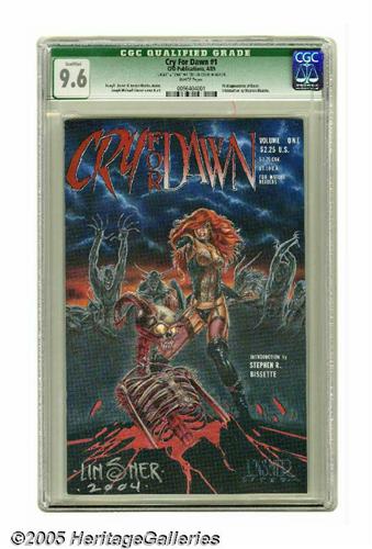 <B>Cry For Dawn #1 (CFD Publications, 1989) CGC Qualified NM+ 9.6 White pages.</B></I> First appearance of Dawn. Introduction by Steve Bissette. Joseph Linsner cover and art. CGC notes, "Linsner" and "2004" written on cover in marker." Overstreet 2005 NM- 9.2 value = $100. <I>From the collection of Chris Bell.</B></I>