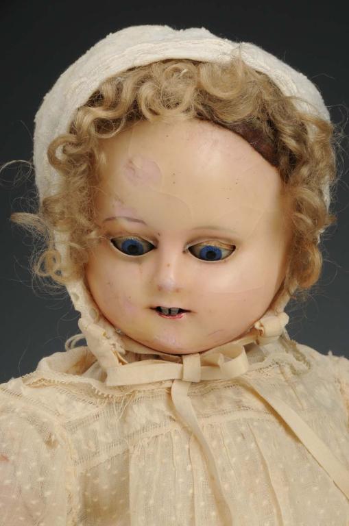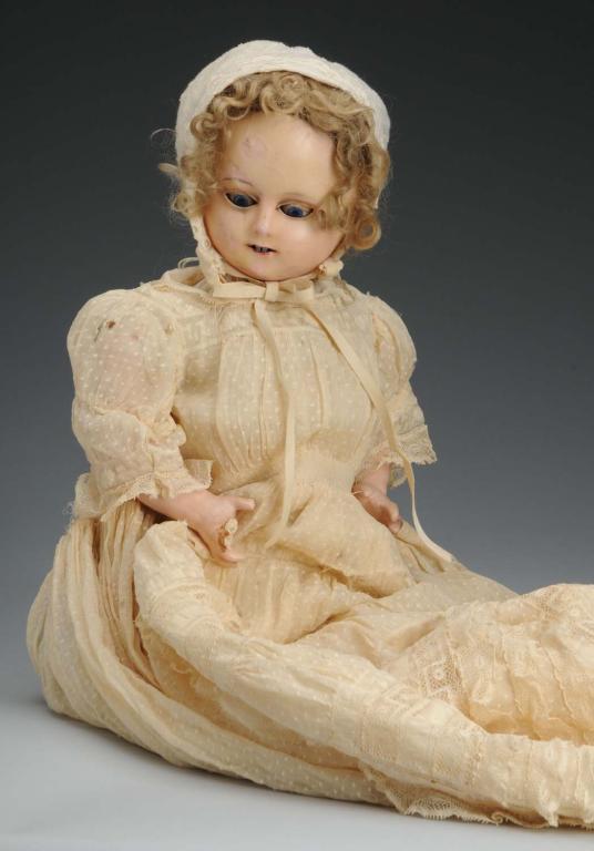 Description Wax over papier mache head, open mouth with upper and lower teeth probably made from bamboo, blue glass eyes, and a leather body with composition lower arms and legs. Well dressed in antique clothing. The key wind mechanism is found inside the torso and when key is wound, baby turns head from side to side, eyes raise and lower, and arms and legs alternately go up and down. Slight crazing to wax surface on face and missing two fingers on right hand. Condition (Good). Size 21" T.