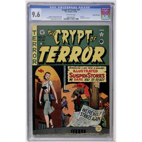 <B>Crypt of Terror #17 Gaines File pedigree (EC, 1950) CGC NM+ 9.6 Off-white pages.</B></I> The first issue of this title carried over the numbering from <B>Crime Patrol</B></I>, where two issues previously, the Crypt Keeper and the Crypt of Terror had been introduced. This was in effect the first EC New Trend title to hit the newsstands in 1950, and this copy is undoubtedly nicer than any of those newsstand copies! Currently ranked in the Top 5 of most valuable horror comic book issues by Overstreet, it's moved up a notch from 2006, and will probably take over fourth place by 2008. Johnny Craig did the cover and also provided interior art, along with Al Feldstein and George Roussos. CGC has certified this as a Gaines File copy, but a certificate does not accompany the book. Overstreet 2007 NM- 9.2 value = $4,600. CGC census 5/07: 3 in 9.6, 1 higher.<BR><BR><b>Shipping:</b> Comics - Slabbed (certified) (<a target="_blank" href="http://www.heritageauctions.com/common/shipping.php">view shipping information</a>)