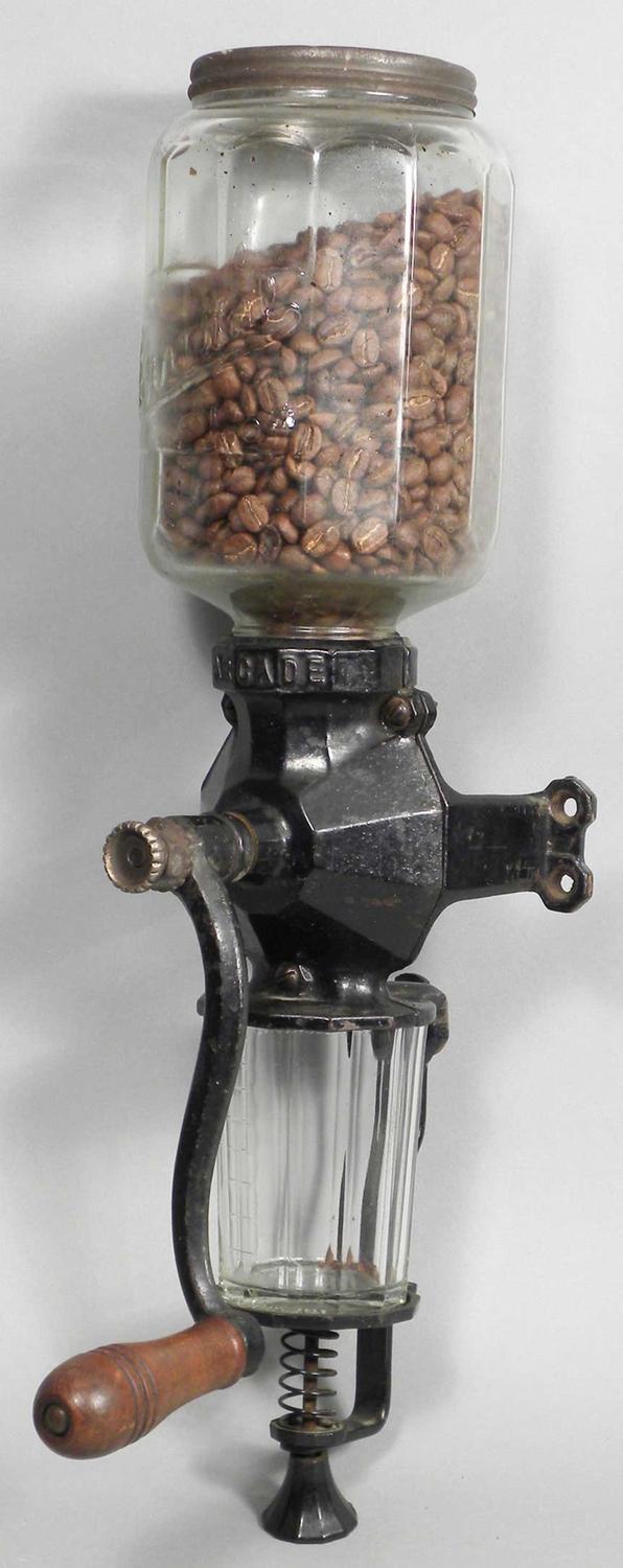 Crystal #4 Arcade Wall Mount Coffee Grinder. Comes with original glass measuring cup. Very good original condition.