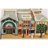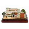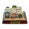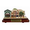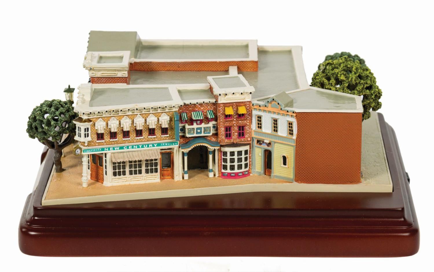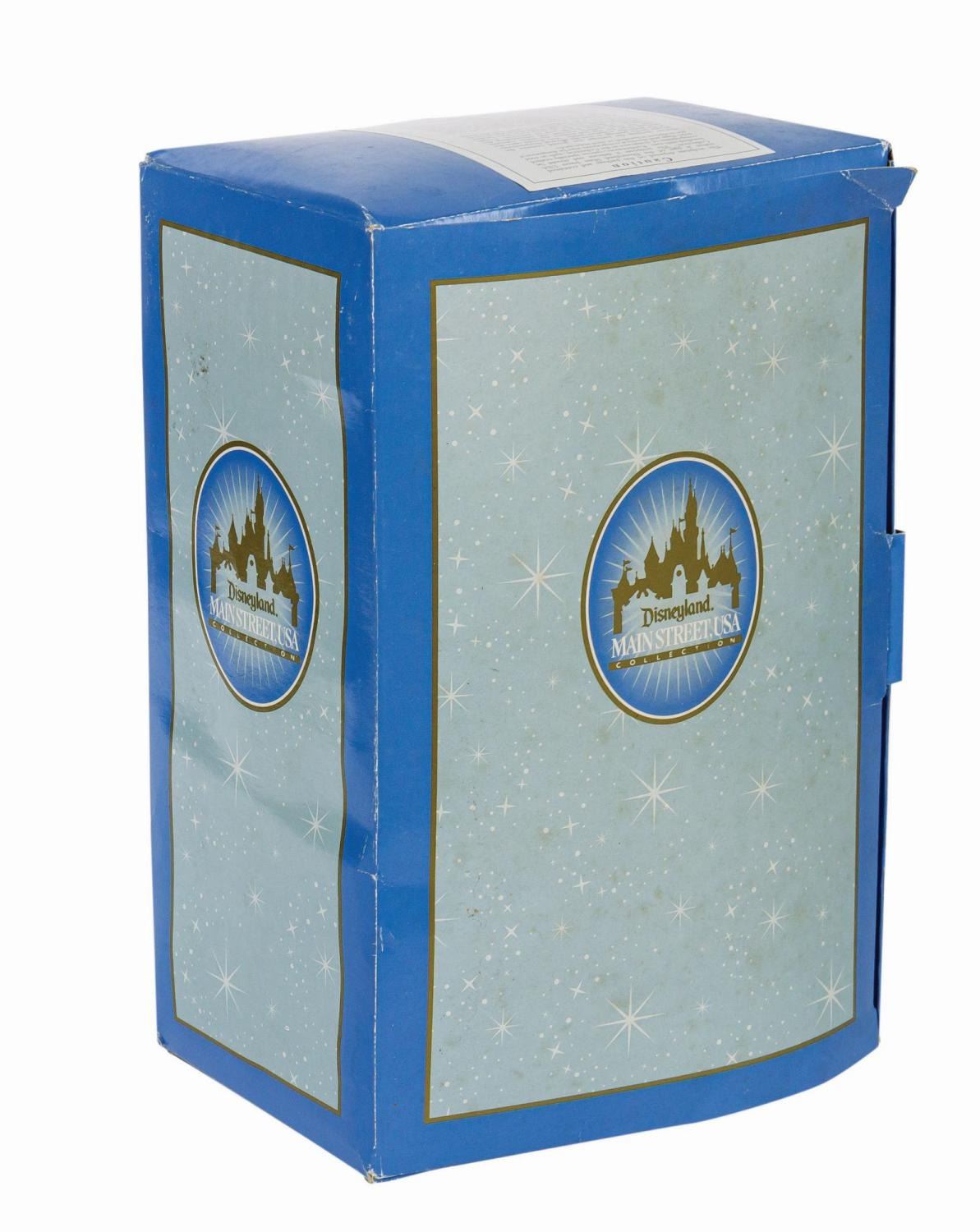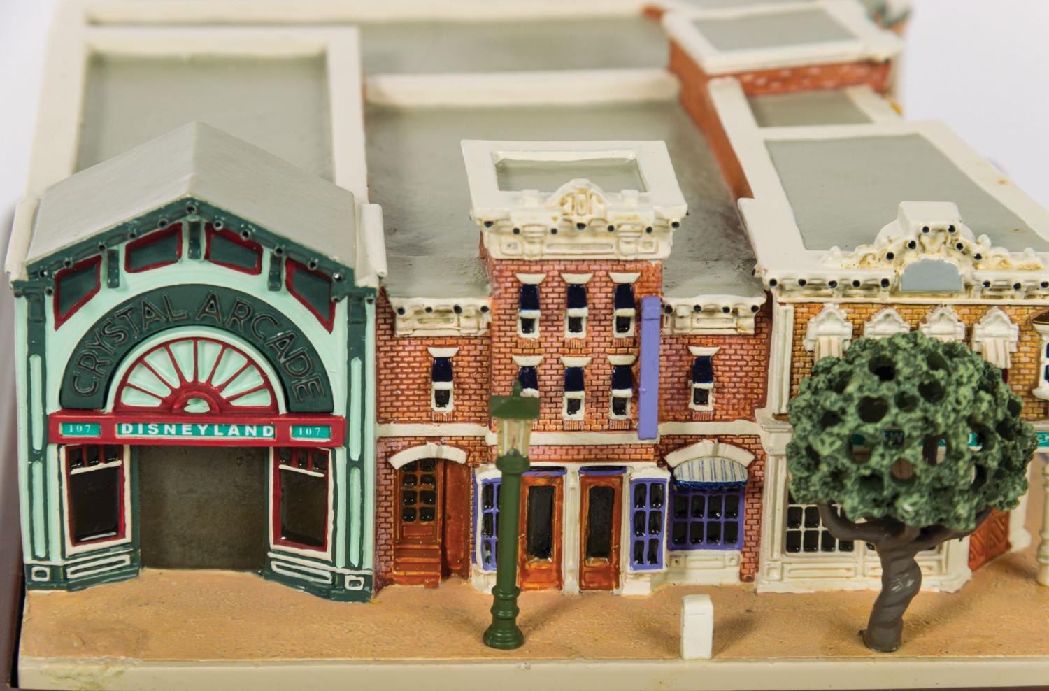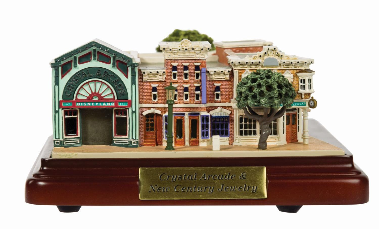 (Disneyland, 2004) A beautiful first edition scale model of Disneyland's Crystal Arcade and New Century Jewelry buildings located on Main Street. This model was created by renowned miniaturist Robert Olszewski for his very popular Main Street, U.S.A. collection of models. The model has lighted elements that are powered by a battery compartment in the base. The first edition model comes in its original box and includes the power cord and certificate of authenticity. Measuring 7"x5.75" and 2.5" tall, the model is in very good condition with minor wear, including minimal crazing on the rooftops, as is often seen with these models, and a rough spot at the edge of the piece, in front of the Arcade. The box was exposed to moisture, which has caused faint spotting and warping.