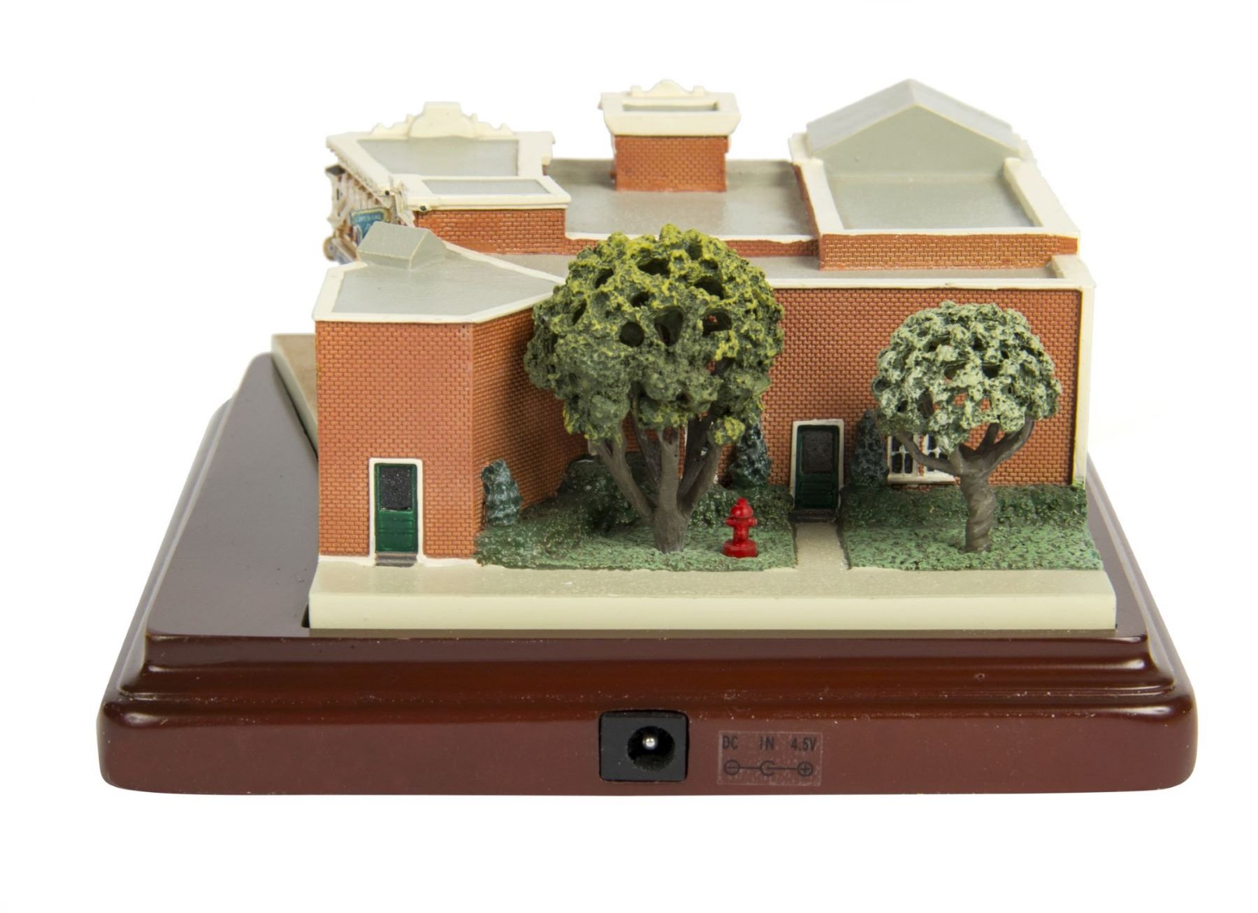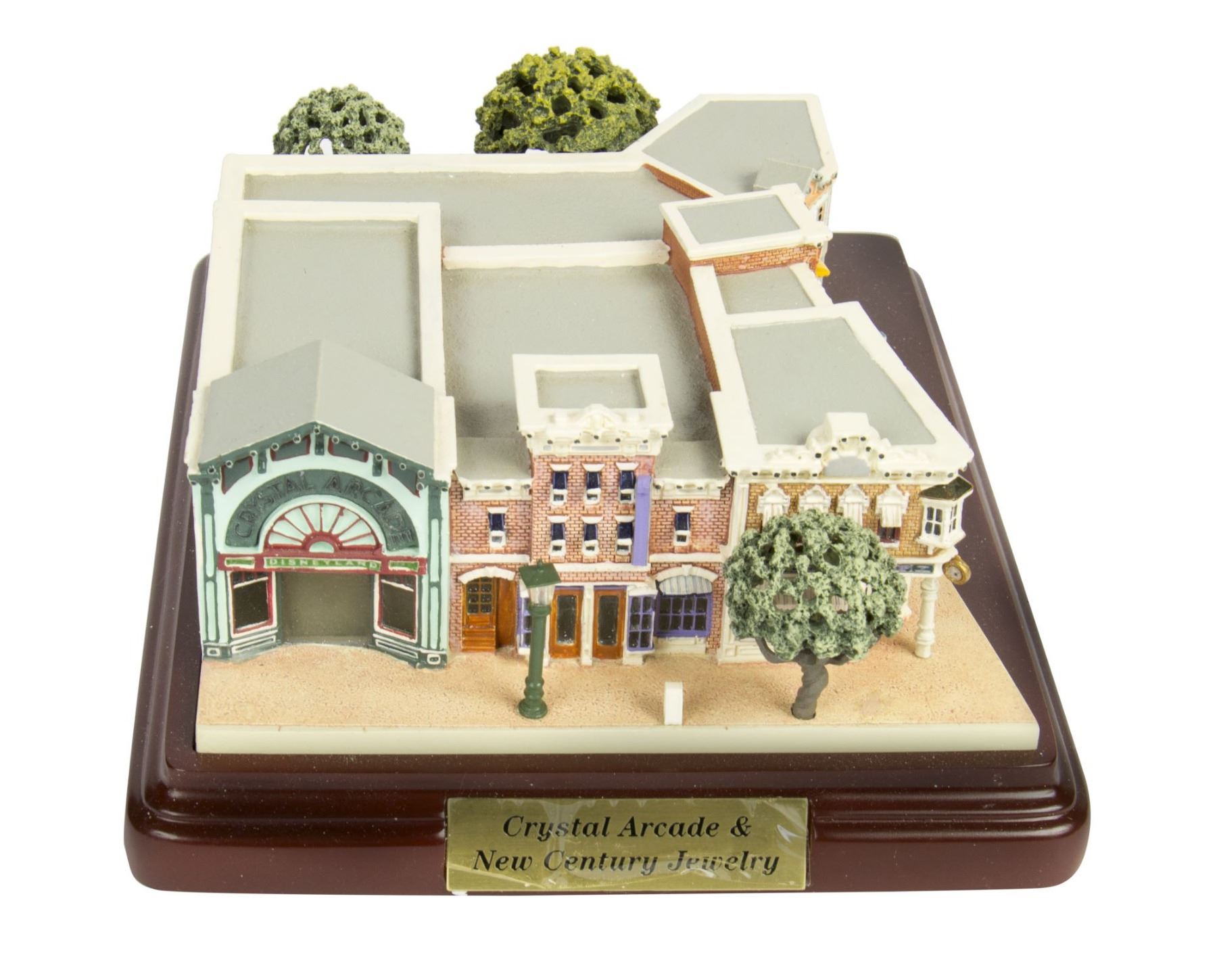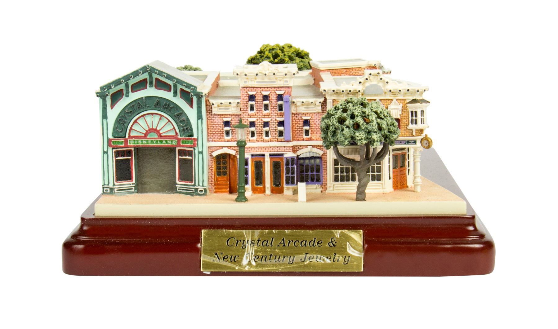 (Disneyland, c.2007) A beautiful scale model of Disneyland's "Crystal Arcade" and "New Century Jewelry" shops located on Main Street. This model was created by renowned miniaturist Robert Olszewski for his very popular Main Street U.S.A. collection of models. This model has lighted elements that are powered by a battery compartment in the base, and the model comes with its original box. Measuring 5.75"x7" and 2.5" tall, the model is in very good condition with little wear.