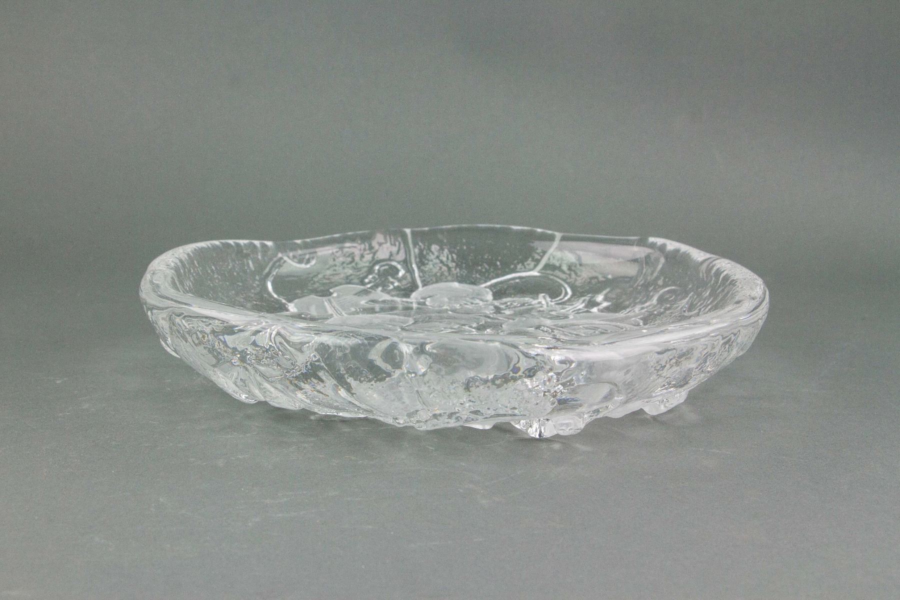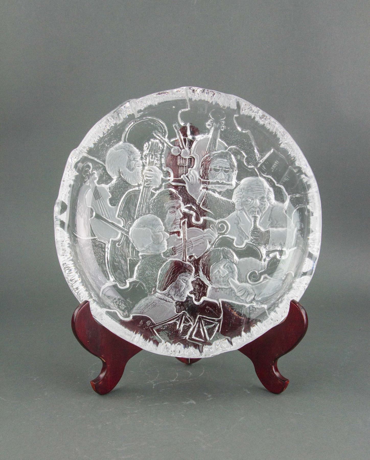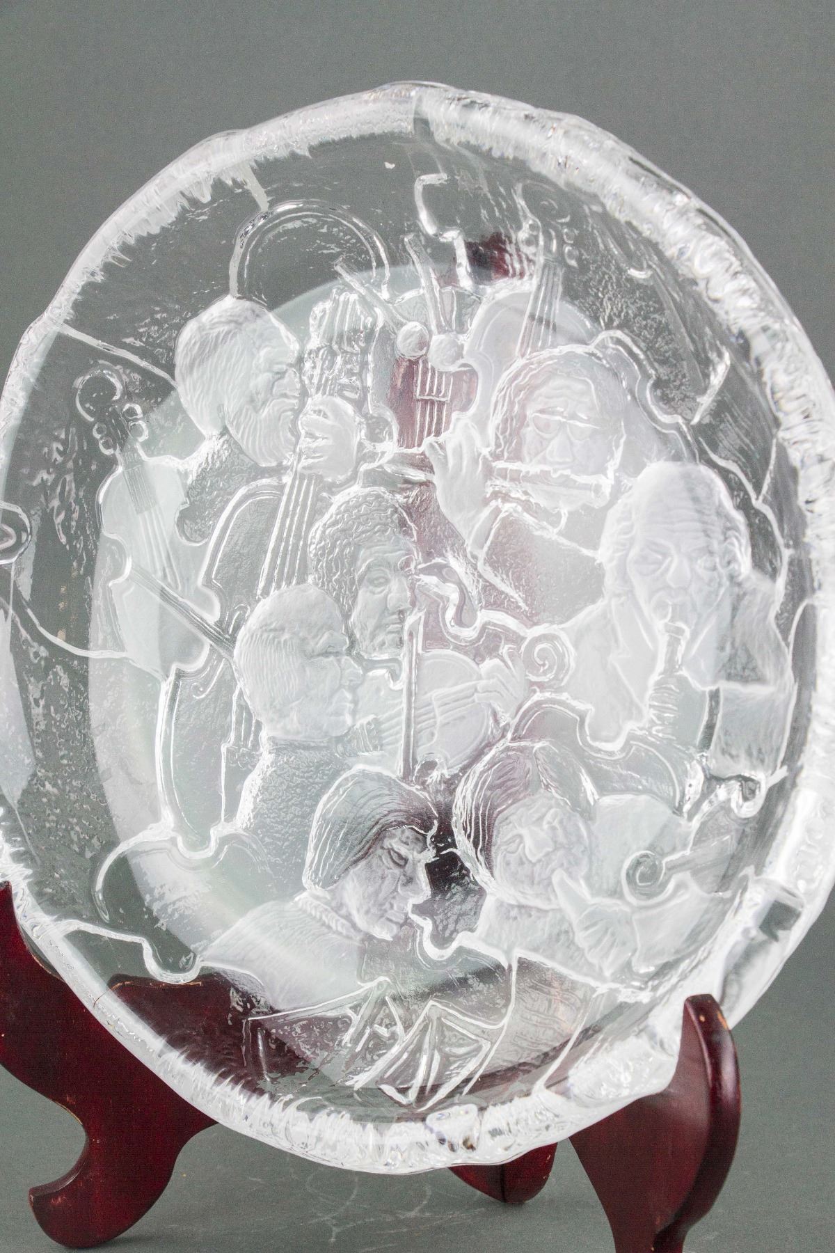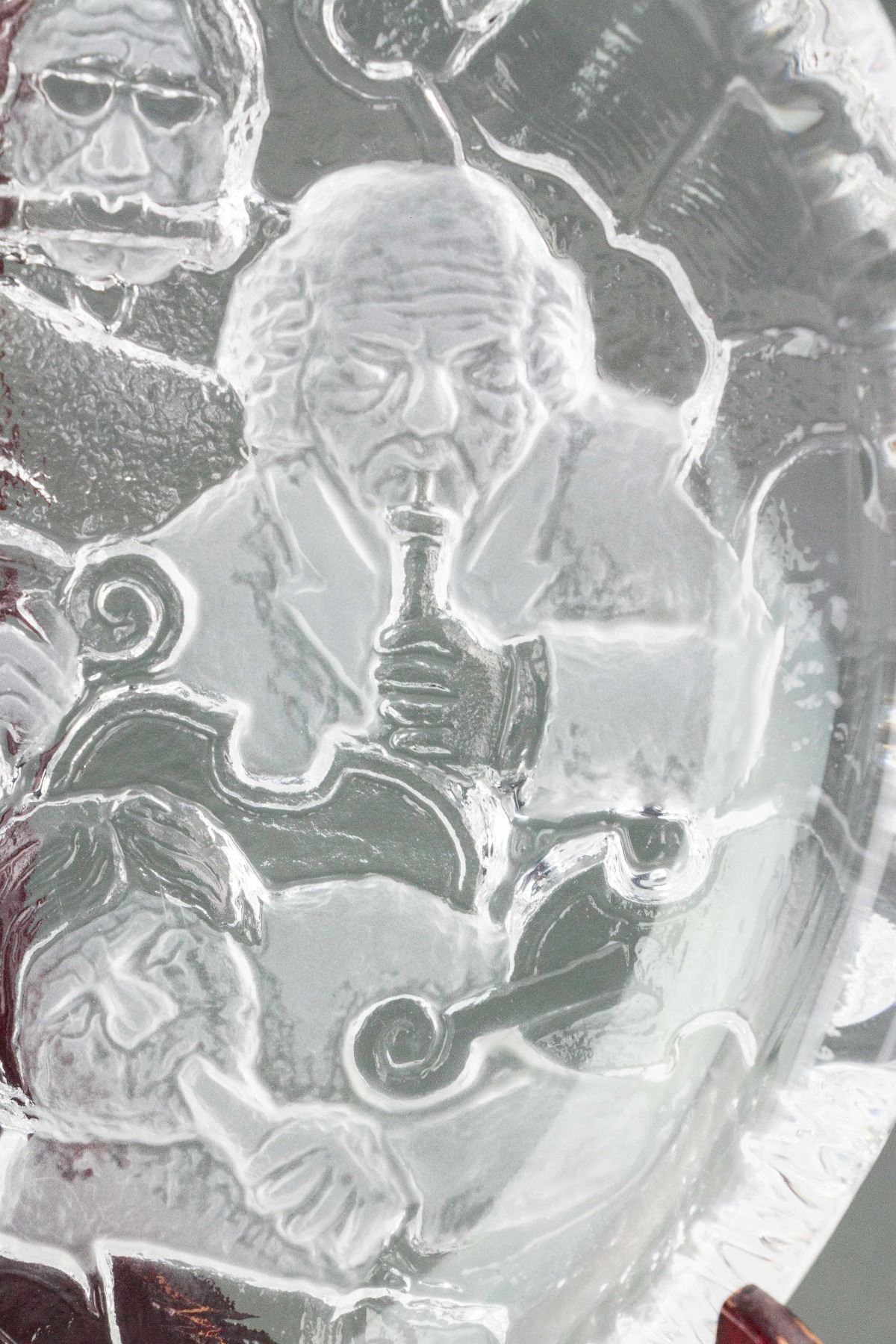Crystal ashtray; of rounded edge; carved with the scene of people playing musical instruments; H: 4.5 cm, D: 25.5 cm, 2838 grams