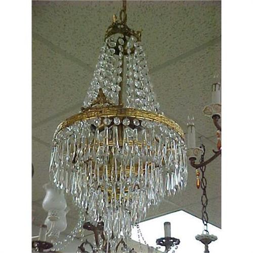 This is a gorgeous French style chandelier with beaded crystal ropes and beaded basket. there are 4 interior lights. This piece is perfect for that small area ie: bathroom/powder room, hallway/gallery or a small dining room.