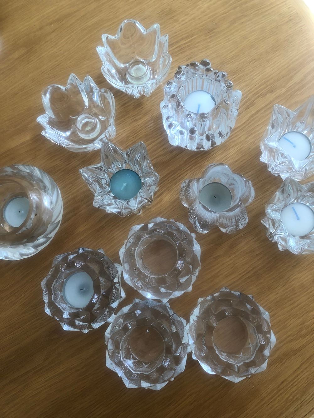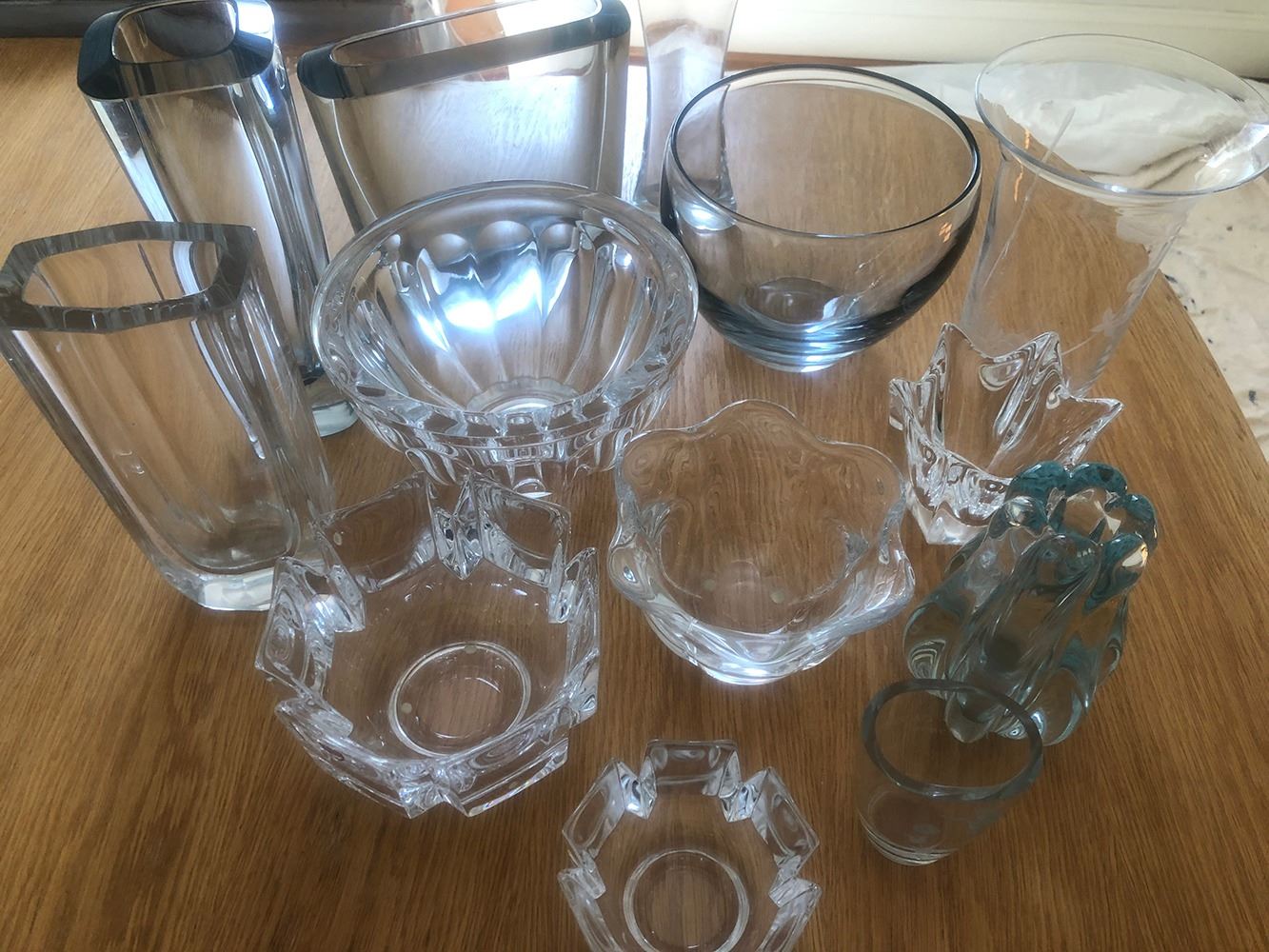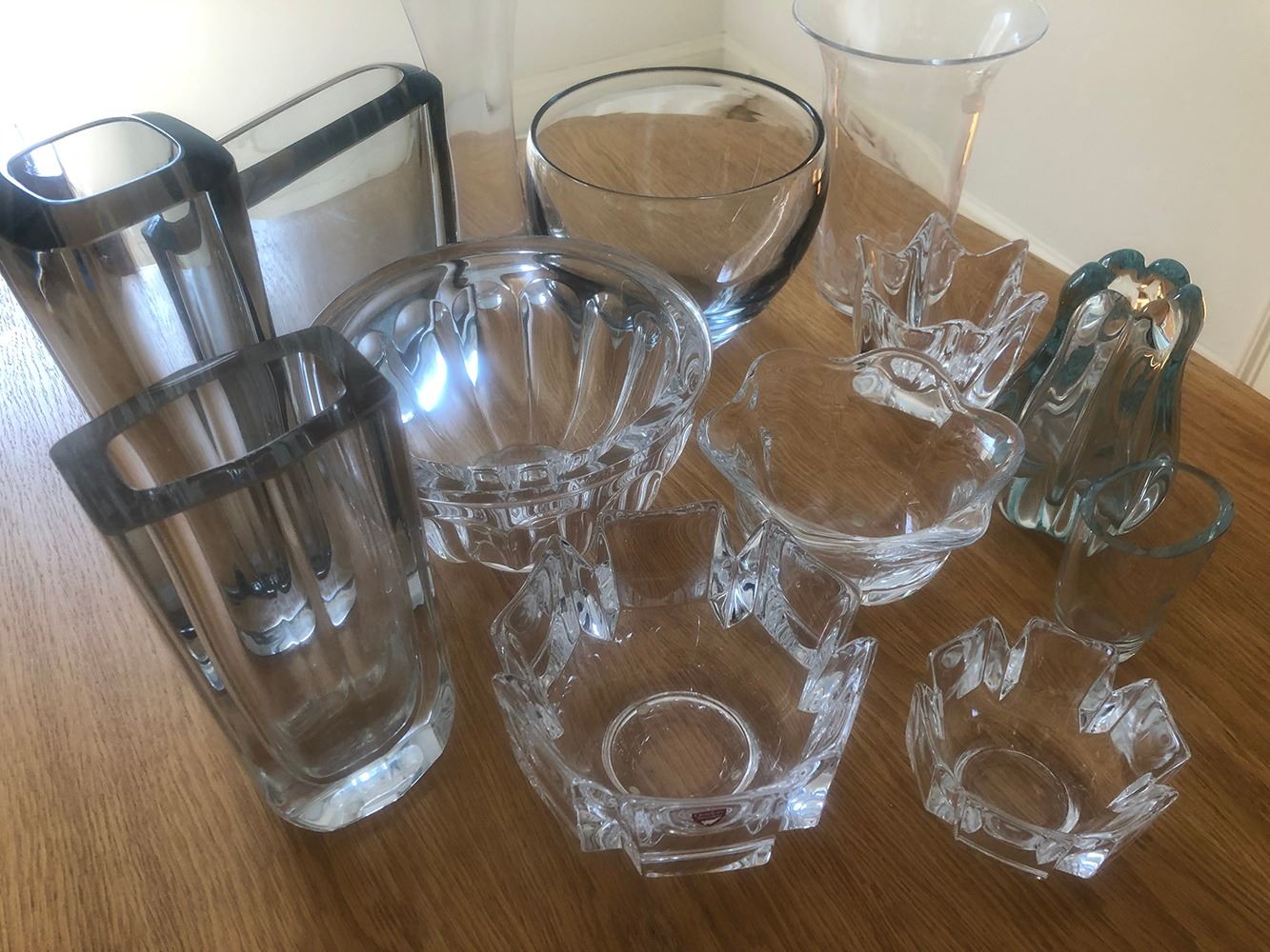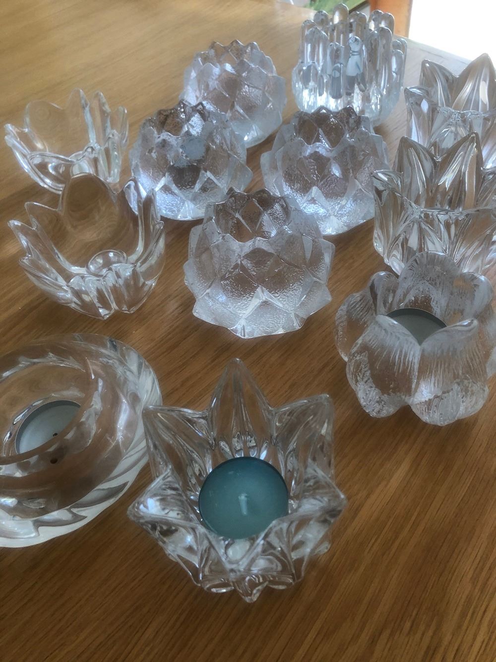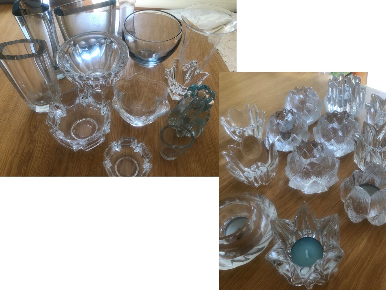 Crystal 6 vases and 6 bowls including Corona, Orrefors, Sweden, Kosta, Sweden, and assorted crystal candleholders including 10 asserted with tealights, Orrefors and Kosta Boda, Iittala, Finland, 1 pair standard candles candle holder Orrefors, Sweden.