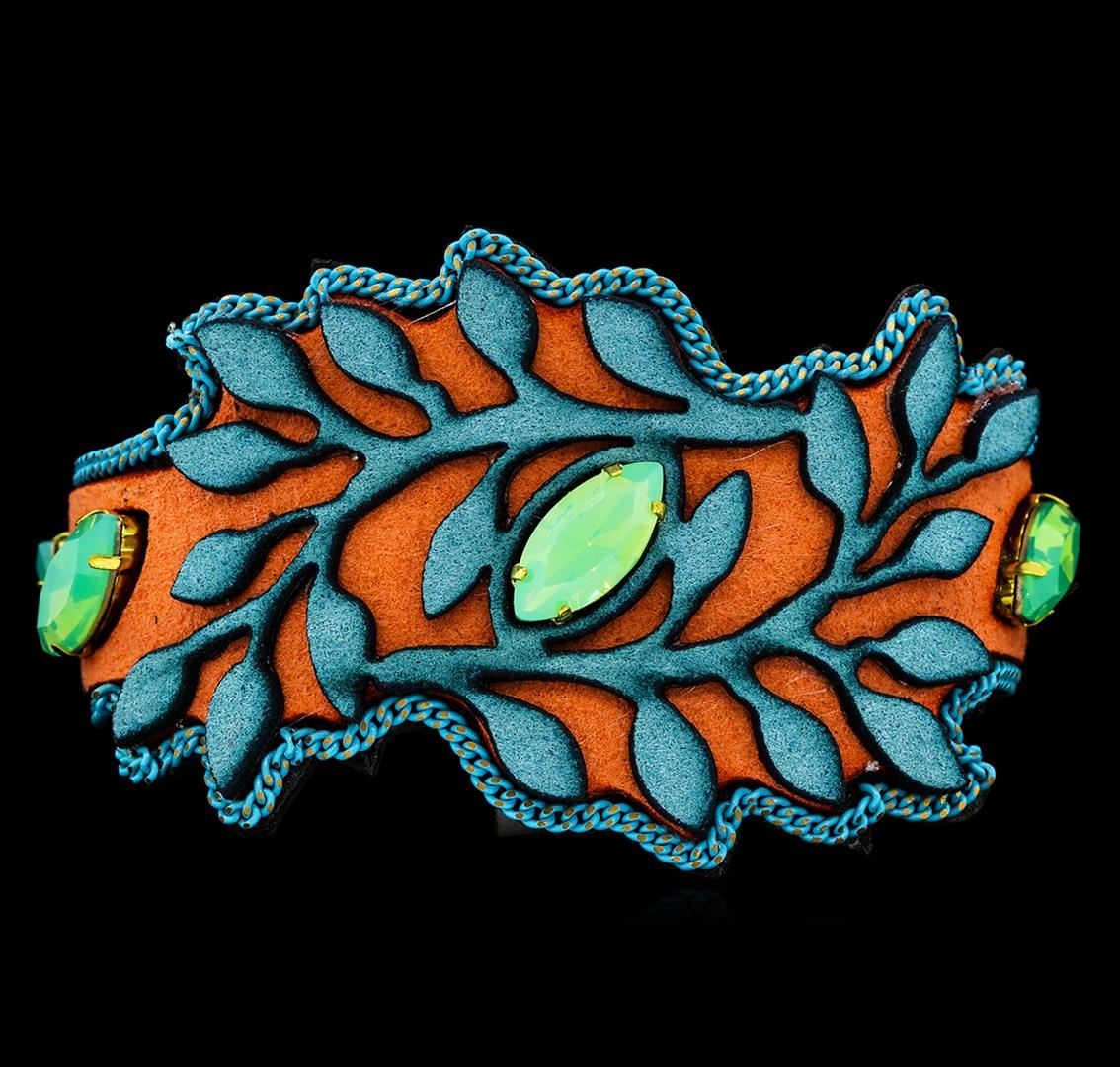High end designer jewelry. Crystal Branch Bracelet - Gold Plated. Gold Plated Mag Clasp. Coral/ Blue. 7.5inches. Total Weight: 25.5 grams.
