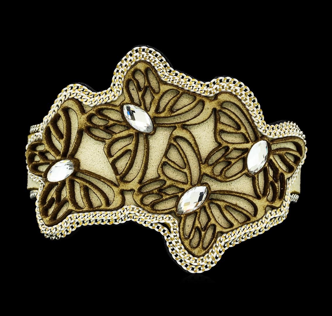 High end designer jewelry. Crystal Butterfly Bracelet - Gold Plated. Gold Plated Mag Clasp. Nude/ Brown. 7.5inches. Total Weight: 25.9 grams.