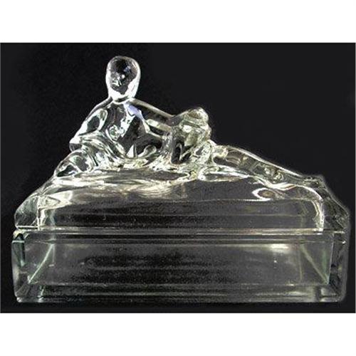 Known as Cleopatra ll this powder jar is shown and described on pages 36-37 of Whitmyer - Bedroom & Bathroom Glassware of the Depression Years. Produced by the American Glass Co., circa 1940, in crystal elegant depression glass and features a classically attired woman [Cleopatra] reclining. The dresser box measures 4 3/4 inches tall by 6 1/2 inches wide by 3 3/8 inches deep and is in excellent condition