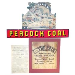 Crystal Café-Lewistown, PA embossed cdbd. sign (calendar missing), adv. card for local businesses in Lewistown, PA, matted paper sign for The Fair Store, Akron, O & Peacock Coal tin sign, 36"W.