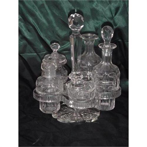 Crystal Castor Set 9' tall x 7' diameter, oil and vinegar, open salt, pepper shaker and mustard pot. Unusual Glass Stand. Engraved "Boven". Holder damaged as shown in photo, there ars several chips on the underside of the holder and one stopper is missing, but it is still a beautiful castor set.