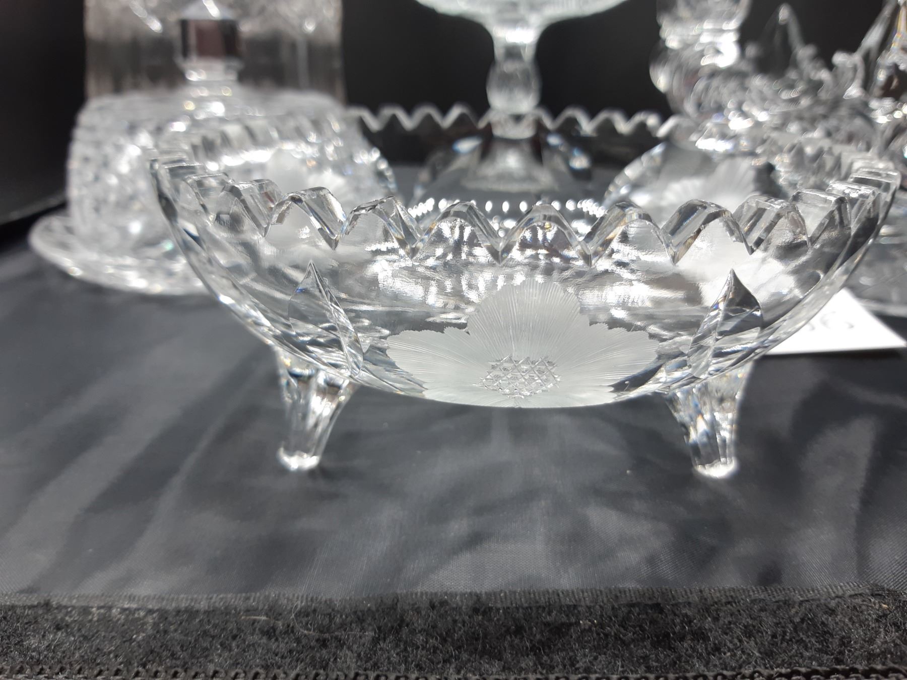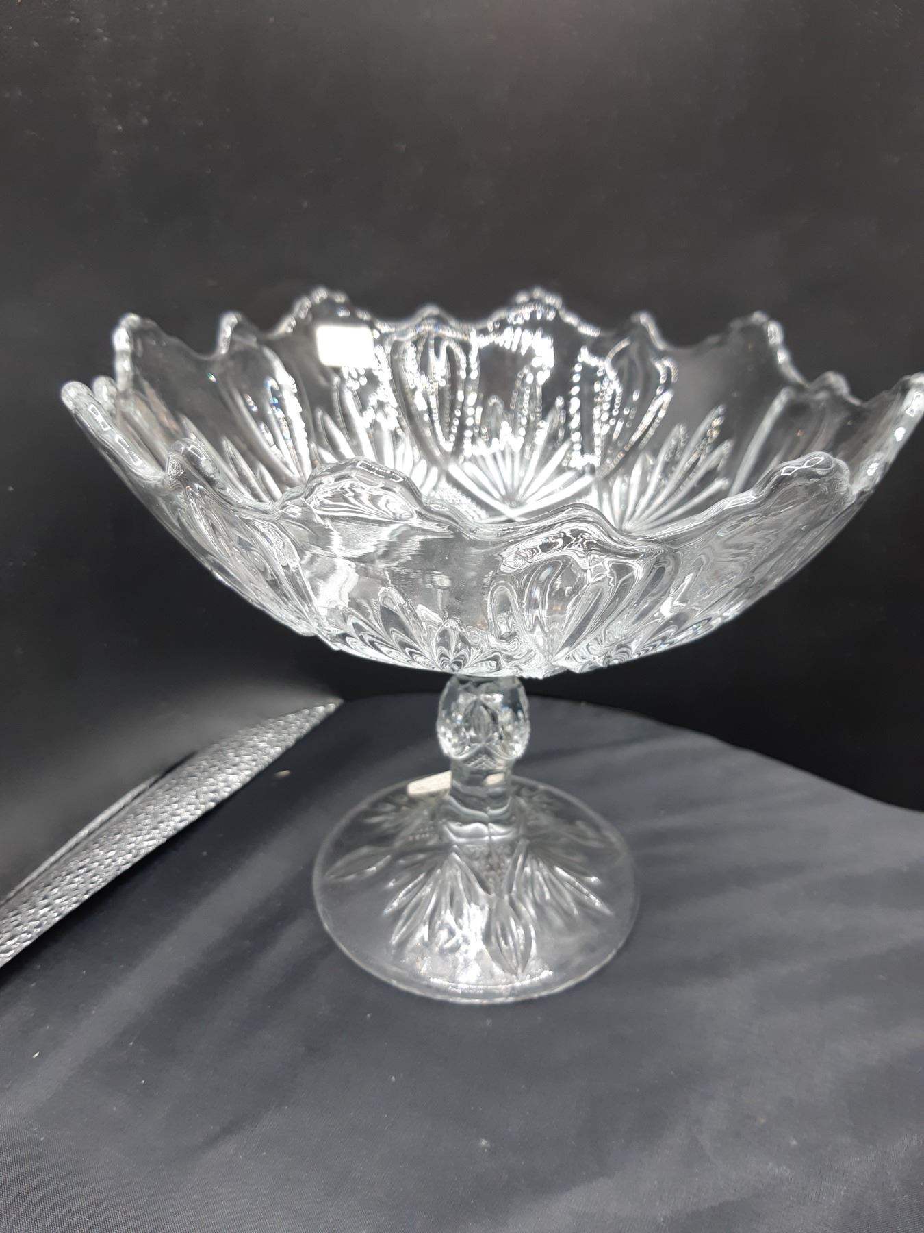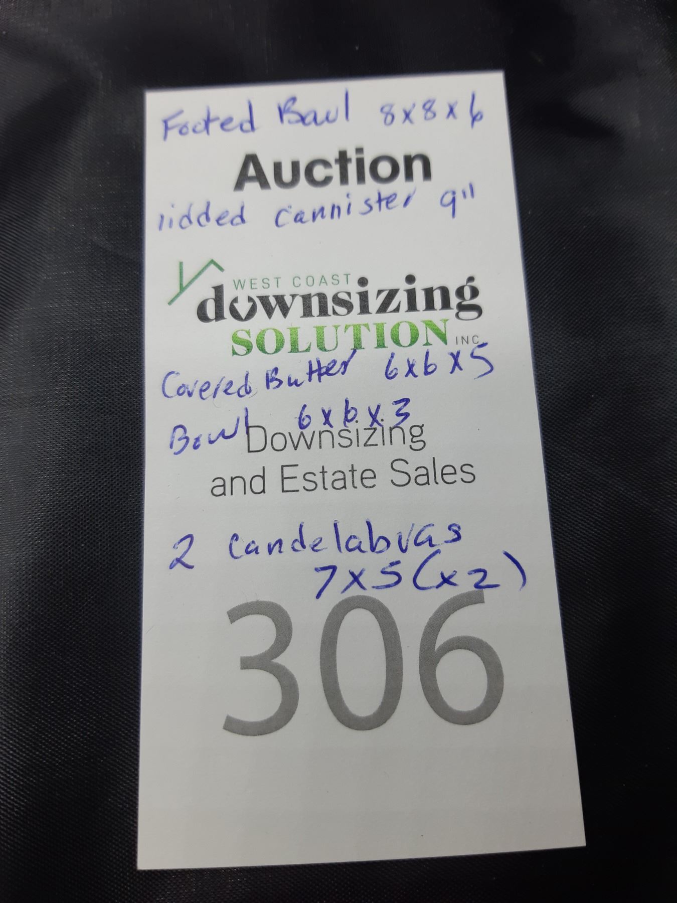 Footbowl 8x8x6, Lidded Cannister 9", Covered Butter 6x6x5, Bowl 6x6x3 and 2 candelabras 7x5. Bring packing material and pickup at 9 am