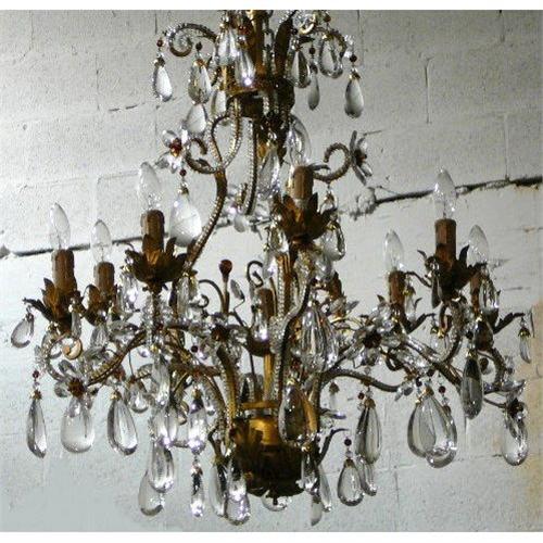This is a graceful and elegant crystal chandelier with large clear crystal teardrops and amber colored crystal flowers. There are nine lights...eight candlestick exterior and one interior. It is wired for USA use and will make a spectacular statement in any interior.