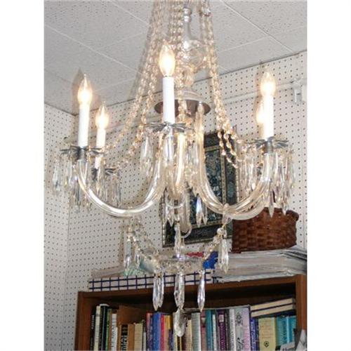 This is an elegant and graceful crystal chandelier ceiling fixture with six candlestick lights and glass arms. It is wired for USA use and ready to light up your room.